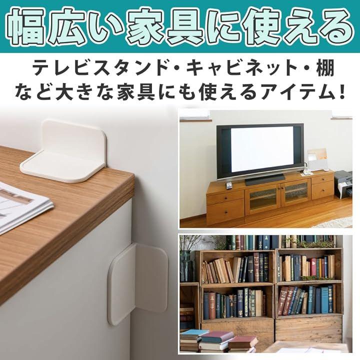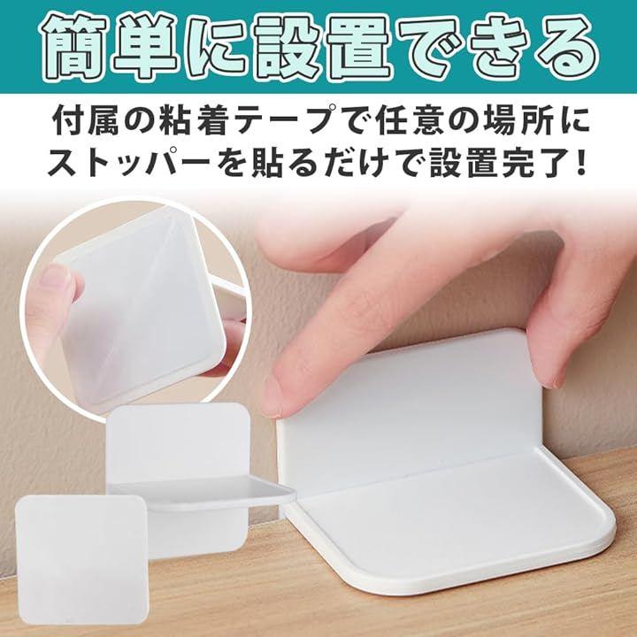 使い方は付属のジェルマットをストッパーに貼ってから、家具と壁面にそれぞれ接着させるだけ。ストッパーは天板/側板どちらにも対応しているので、家具の形や配置によって使い分けられます。