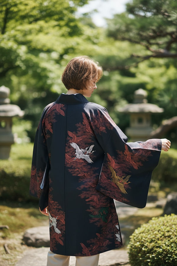 これはアンティークの羽織です。生地自体に織り込まれた地模様は、糸を二重にするなどの工夫で光沢のある柄を浮かび上がらせ、見る角度で表情が変わるのが特徴です。デニムやスカートと合わせてドレスアップも楽しみやすく人気な商品です。