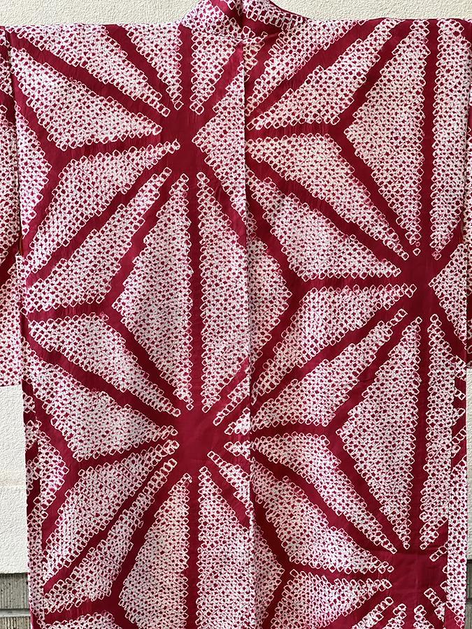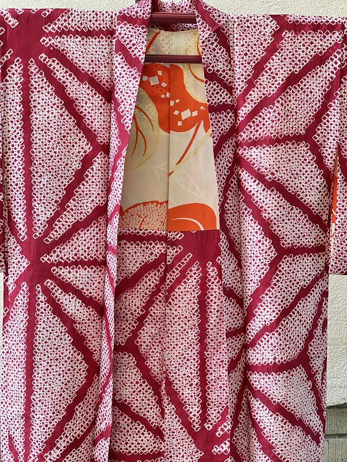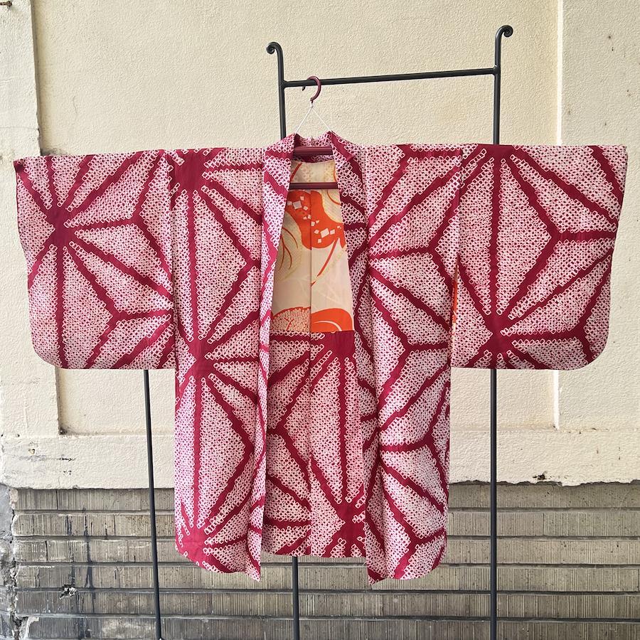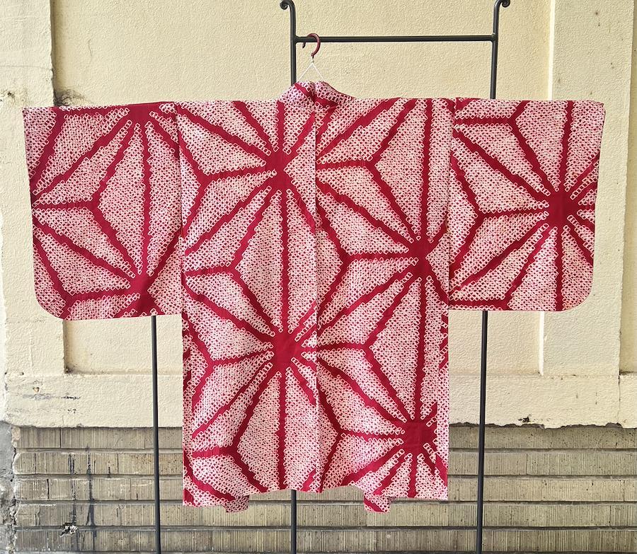 これはアンティークの羽織です。こちらは絞染めという技法で柄が描かれています。デニムやスカートと合わせてドレスアップも楽しみやすく人気な商品です。