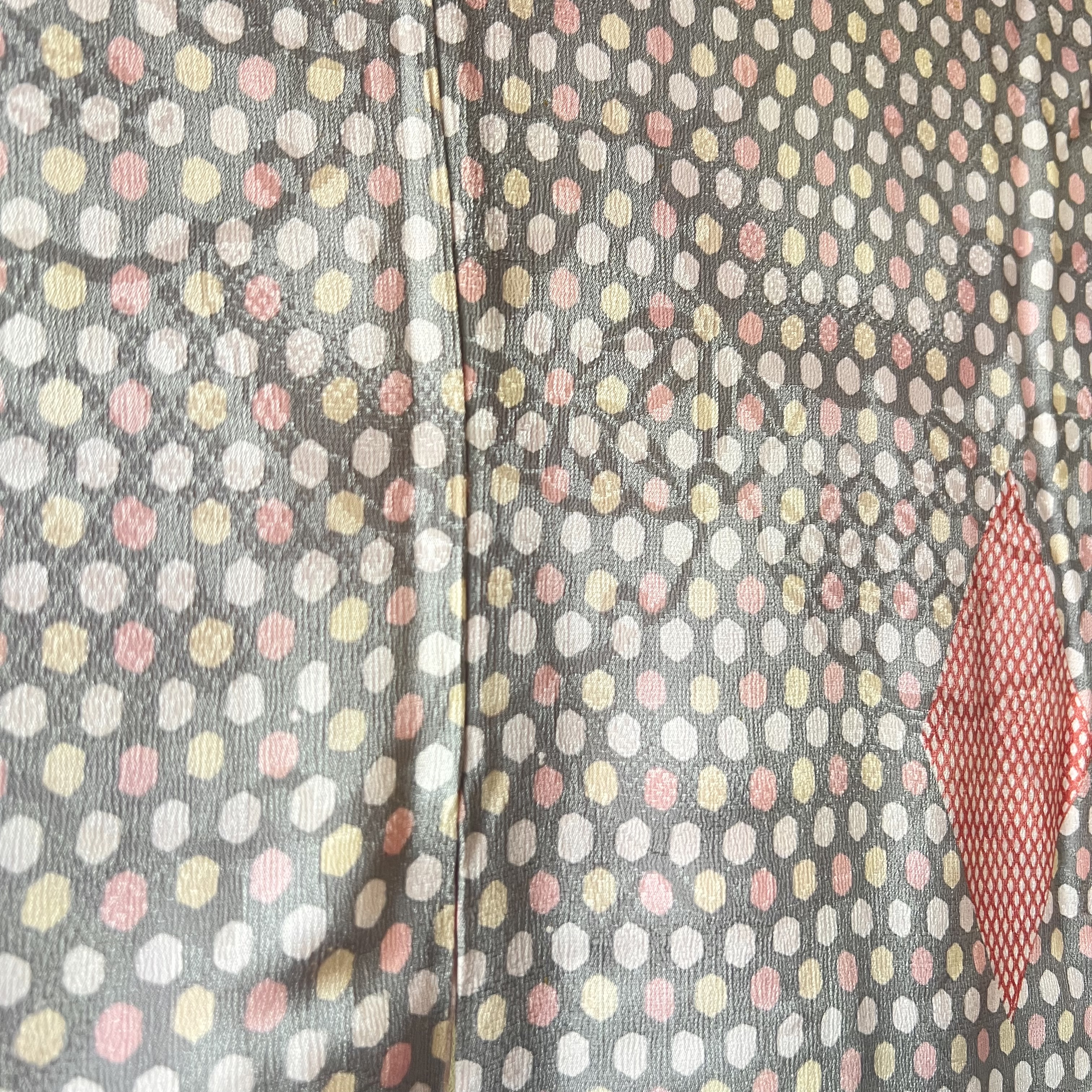 アンティークの羽織は50年以上前に制作されたもので、経年変化によるシミがあります。アップの画像はシミがある部分です。ご購入前に画像をご確認頂き、了承の上ご購入ください。