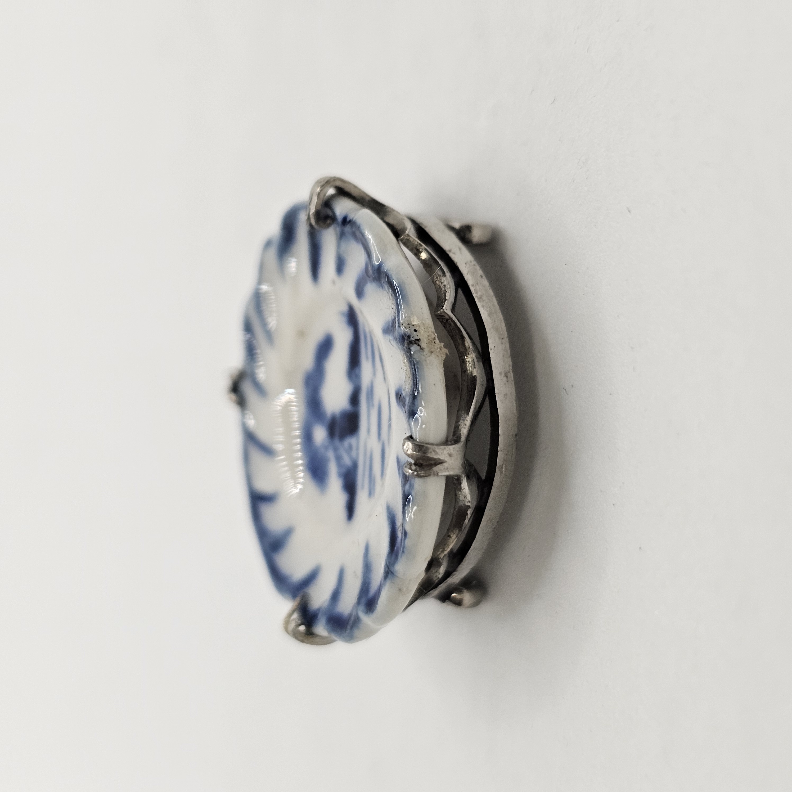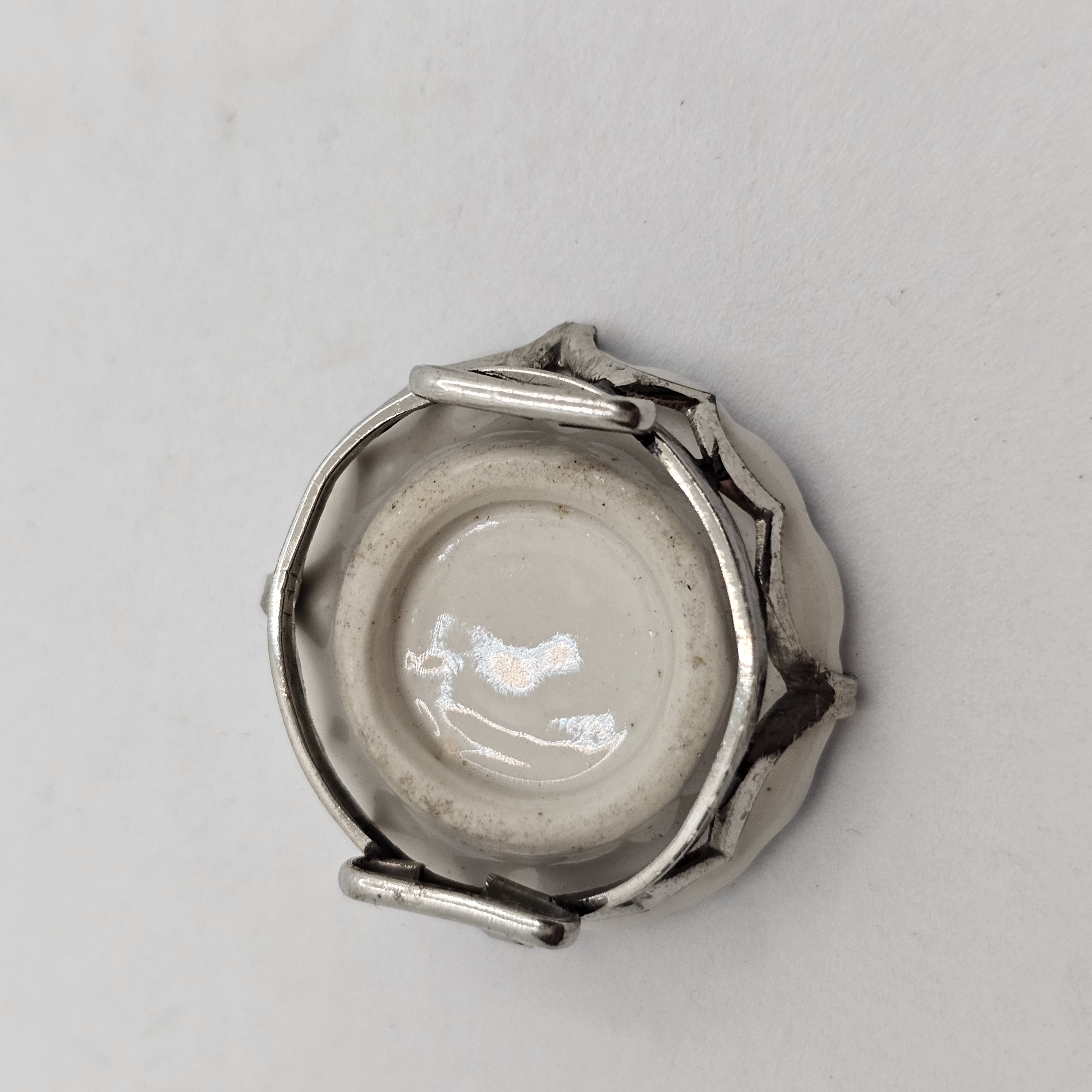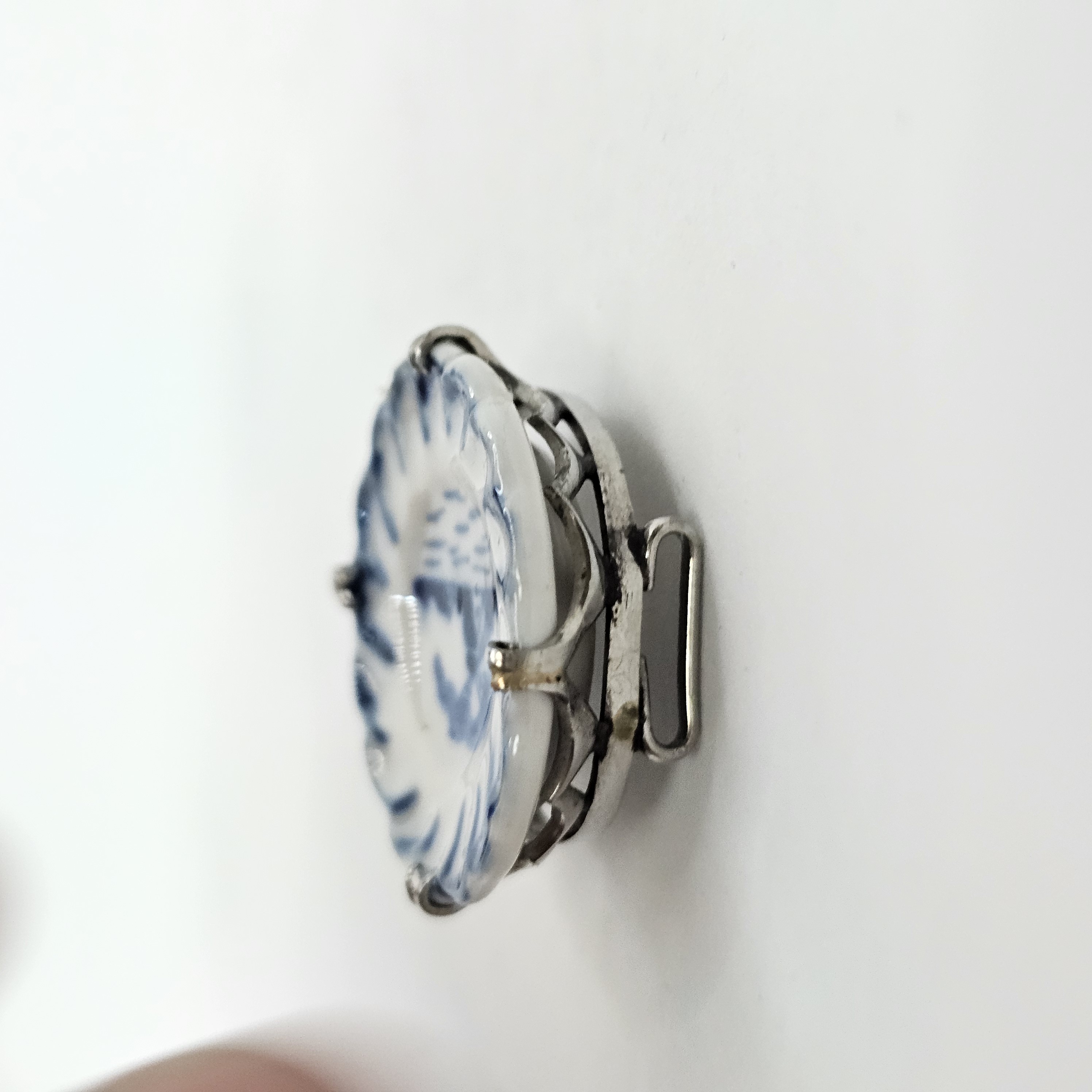 陶器を固定する台座の金属細工も繊細で、底部には帯締めを通すための金具が付いています。そのままブローチとして使用したり、コレクションとして飾っても楽しめます。