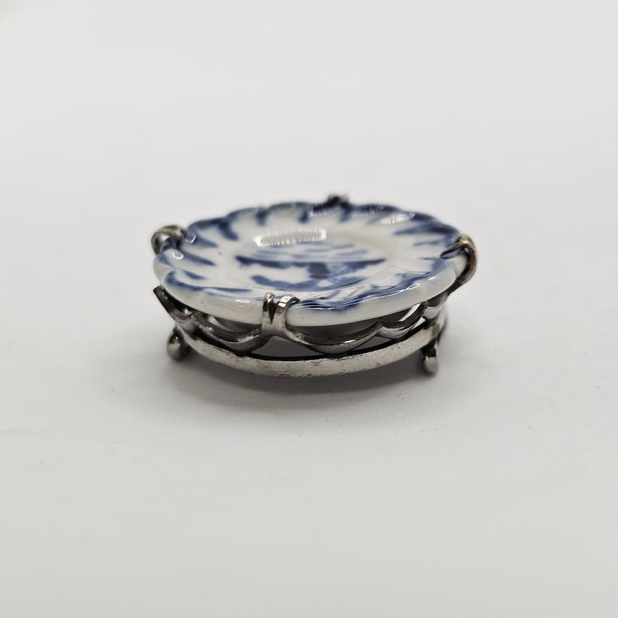 皿部分は陶器製で、白磁にブルーの染付で風景画のような絵柄が手描きされています。日本の伊万里焼や古伊万里、あるいはヨーロッパのデルフト焼やオールドノリタケの雰囲気を持ち、和洋どちらのスタイルにも合うデザインです。