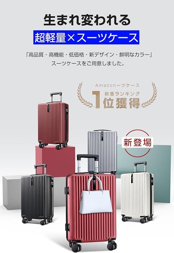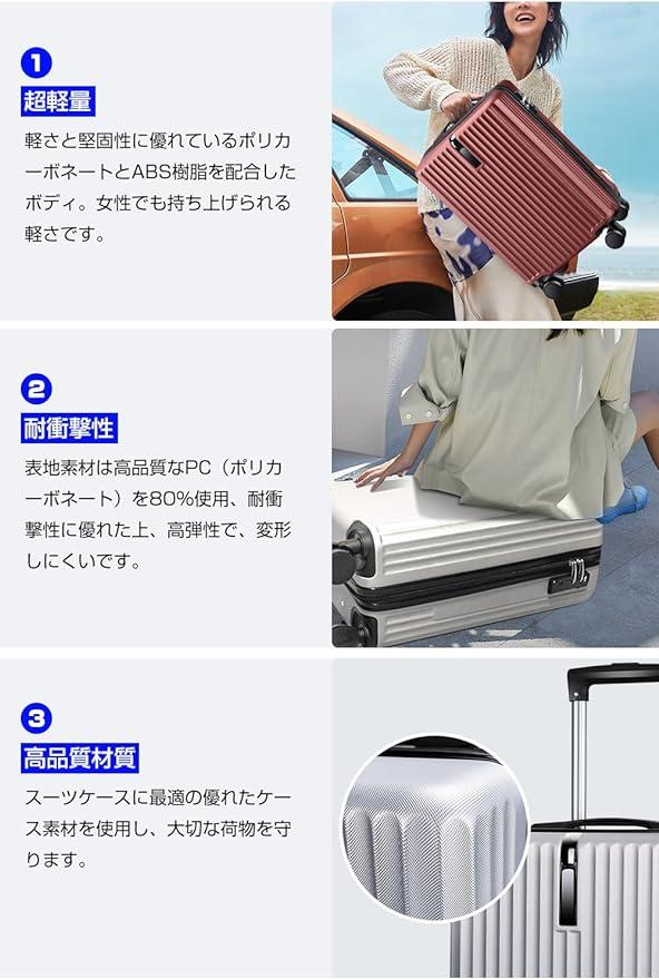 ■商品説明【新登場・超軽量・合理的な仕切りデザイン】縦縞デザインにより、シンプルかつファッションです。超軽量で収納便利、初心者から旅慣れた方まで幅広くご利用スーツケースです。持ち運びもラクラクです。 【大容量・隠しフック機能】こちらのスーツケースは収納能力が非常に高く、初心者の方から旅慣れた方まで幅広くご利用頂けるスーツケースです。素材は軽くて耐久性に優れたABS樹脂を採用しております。また、隠しフックもあり、鞄などかけて手への負担も軽減してくる キャリーケース です。 【耐衝撃性に優れ美しいデザイン】スーツケースはABS樹脂とPCでのハイブリッド素材。軽量かつ耐衝撃性に優れています。表面はシンプルなデザインの美しさ、驚くほど軽量であること、女性の方でもでも軽々と走行可能です。 【二段調節キャリバー・TSAナンバーロック】超軽量のキャリバー、高さ二段階調節、自分の身長に合わせてスムーズに調整が可能なキャリーケースです。TSAロックも装備されていて、海外旅行にもピッタリ。3桁のナンバーロックを使用し、鍵をなくす心配はありません。 【各サイズ・保証】Sサイズ:56.5cm x 36cm x 22.5cm 本体重量:約2.42kg(付属品含まず)容量:約35L(1~3泊対応) Mサイズ :67cm x 45cm x 25cm 本体重量:約3.06kg(付属品含まず)容量:約60L(1~5泊対応) Lサイズ :77cm x52cm x29m 本体重量:約4.08kg(付属品含まず)容量:約95L(5~7泊以上対応)※サイズ測定には多少の誤差がありご了承ください。 。保証付きで万が一、初期不良や自然故障など不具合が応じた場合、(「アカウントサービス」>「注文履歴」>「販売元」>「質問する」注文番号は領収書に替わります。)