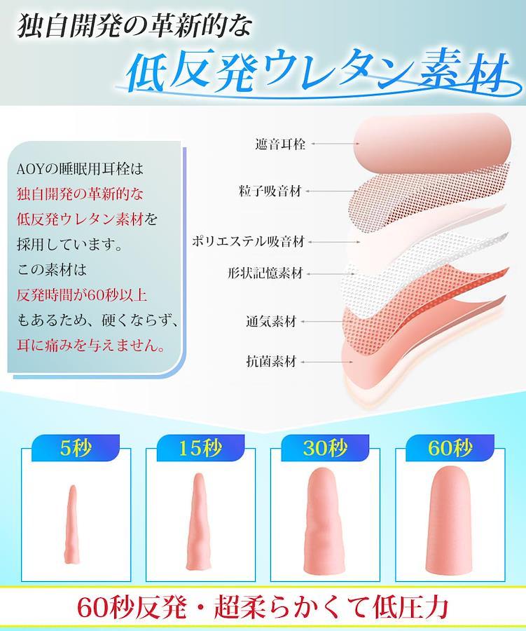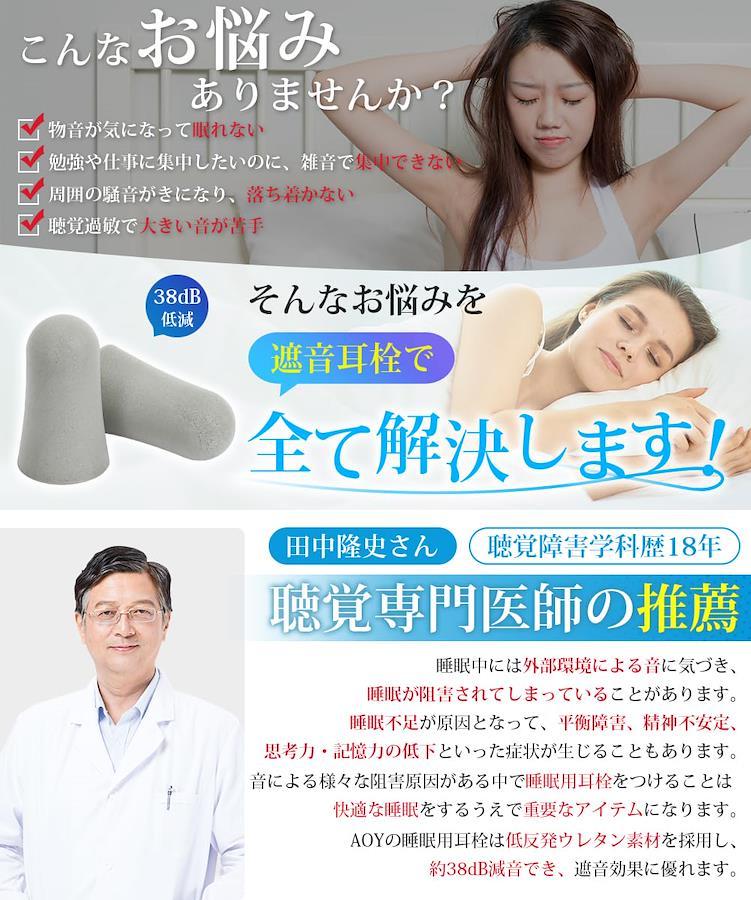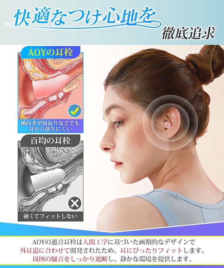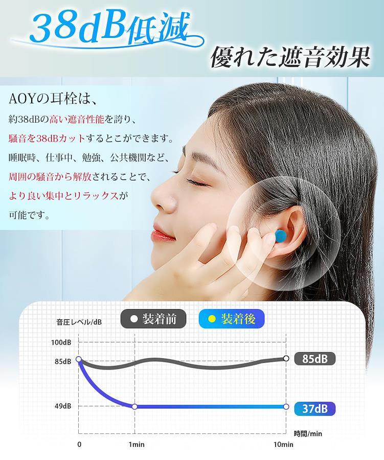 【聴覚専門医師の推薦】 AOYの睡眠用耳栓は、聴覚のプロが推薦する最高の遮音性を備えています。耳孔内部の形に合わせた曲線デザインにより、最小の圧力で耳栓の防音機能を発揮し、耳に優しい装着感を実現します。革新的な低反発のウレタン素材を採用し、耳穴への痛みを軽減し、フィット感をさらに向上させました。さらに、低音から高音まで幅広い音域で他の耳栓に比べて優れた遮音性を発揮できる睡眠用耳栓です。 【最高の快適性を実現】 AOYの耳栓 睡眠用は、独自開発の革新的な低反発ウレタン素材を採用しています。この素材は反発時間が60秒以上もあるため、柔らかくて耳に優しい装着感を提供します。百均の耳栓とは全く異なり、反発力が弱いため硬くならず、耳に痛みを与えません。AOYの耳栓 睡眠用は最高の快適性を実現し、長時間の使用でも耳への負担を最小限に抑えます。勉強、睡眠、集中力の向上など、さまざまなシーンで活躍するAOYの睡眠用耳栓で、より快適な時間をお過ごしください。 【音に敏感な方への最適な保護】 AOYの耳栓は、約38dBの高い遮音性能を誇ります。睡眠時、仕事中、勉強、公共機関など、周囲の音が気になる時に装着することで、耳に不快な音を効果的に遮音してくれます。音に敏感な方の守り神として、AOYの耳栓が快適で安らぎの時間を提供します。革新的な低反発ウレタン素材が耳に優しくフィットし、快適な装着感を実現。周囲の騒音から解放されることで、集中力が高まり、より良い集中とリラックスが可能です。AOYの耳栓とともに、静かで心地よい時間をお楽しみください。 【耳に優しく快適な睡眠を実現】 AOYの耳栓 完全遮音は柔らかくて耳が痛くならない素材で作られています。快適な装着感とちょうど良い遮音性が眠りをサポートします。耳にフィットすることで周囲の騒音を遮断し、静かな環境を提供します。これを装着するとなんだか眠くなり、心地よい眠りを手に入れることができます。長時間装着しても耳への疲れや違和感を感じることなく、安心して使用できます。AOYの耳栓 完全遮音と共に、心地よい眠りを体験してください。 【繰り返し使用可能な睡眠用耳栓】 耐久性があり、繰り返し使えるので経済的、耳穴の健康をしっかり守りますので、安心してご利用いただけます。携帯ケースが付属しており、10ペアの耳栓を収納できますので、外出時にも持ち運びが便利な耳栓です。勉強や仕事、睡眠時はもちろん、飛行機や列車、船、工事現場など様々な場面で活躍します。セット内容は耳栓10ペア、専用ケース2個、日本語説明書となっています。耳栓の使用により快適な環境を実現し、心地よい時間をお過ごしください。(もし耳栓がうまくフィットしない場合は、写真のステップに従って正しく装着し、快適な遮音効果を得ることができます。ご不明な点がございましたら、すぐにカスタマーサービスまでご連絡ください!)