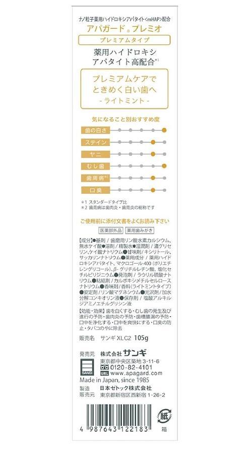 〇商品説明美白歯みがきのアパガードがリニューアル。独自成分「薬用ハイドロキシアパタイト」が、エナメル質を整えて虫歯を予防。プレミオは、「薬用ハイドロキシアパタイト」を高配合(Mプラス・スモーキン・セレナ比)したプレミアムタイプで、ときめく白い歯に。レギュラーサイズ。