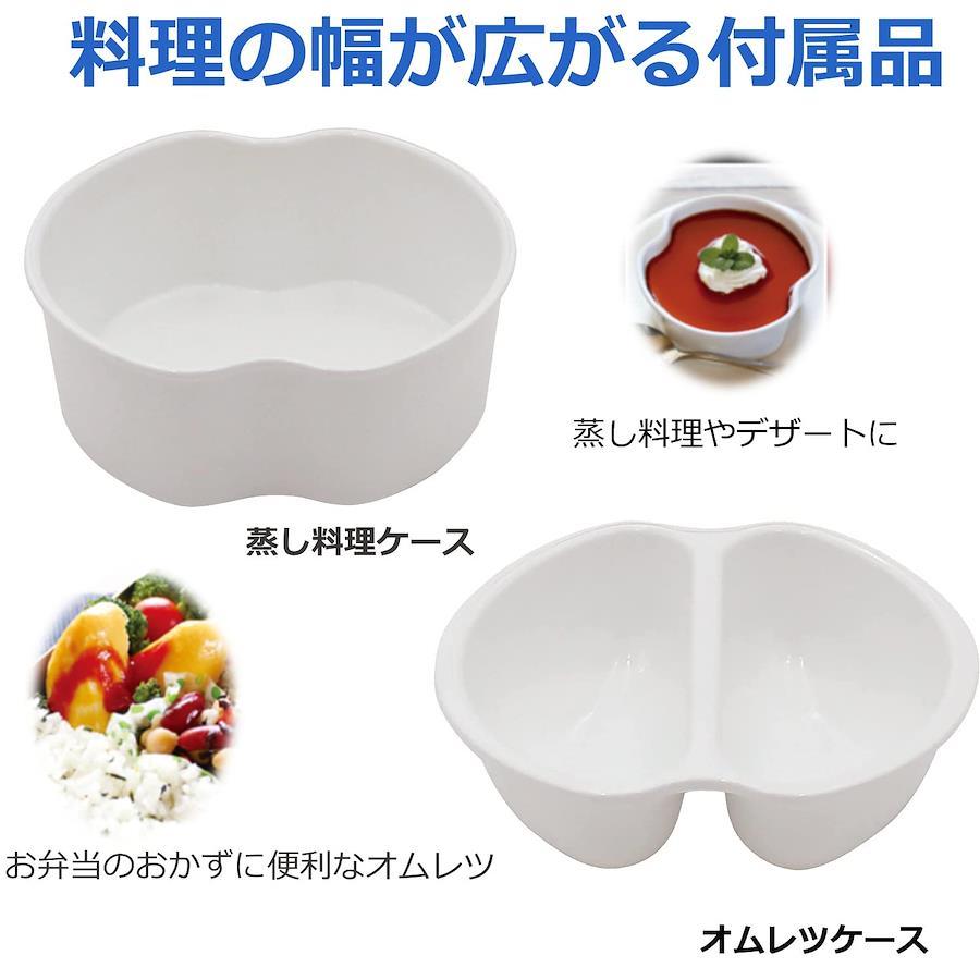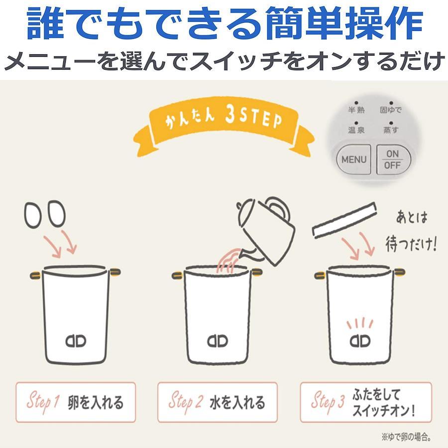 3営業日以内に発送≪新品未開封品≫:電源:AC100V50/60Hz/消費電力400W/モード選択:温泉卵/半熟卵/固ゆで卵/蒸す/:電源コード長:約0.8m/付属品:ゆで卵ケース、オムレツケース、蒸し料理ケース、レシピブック