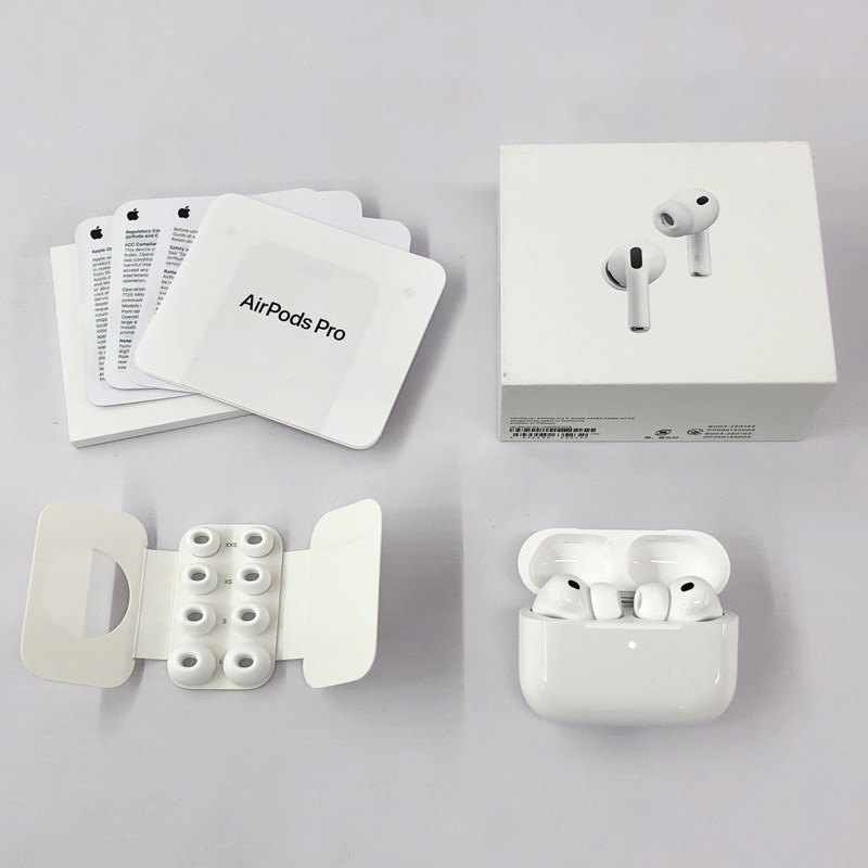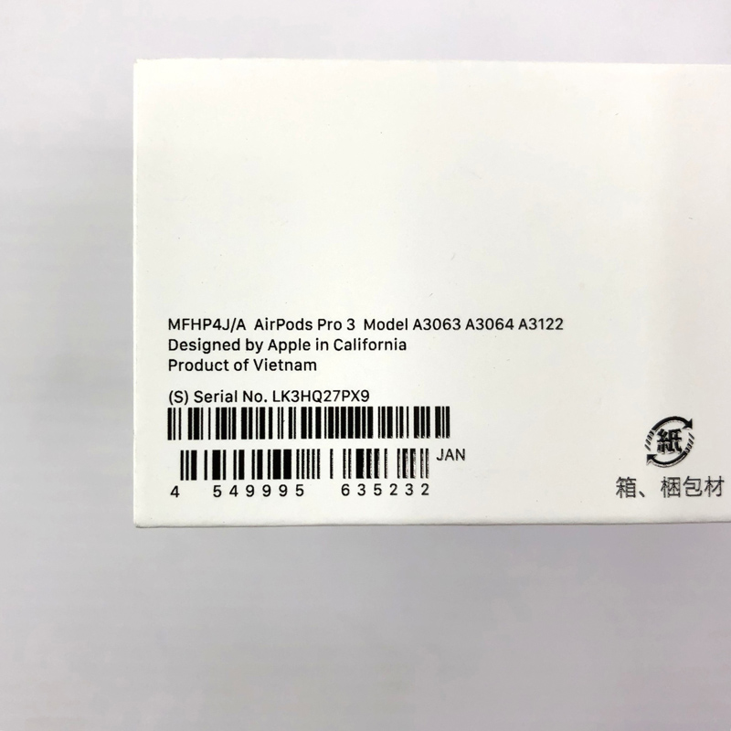 未使用現状品です。※確認のため開封・通電確認を行っています。充電、Bluetooth接続の音声再生、バッテリー動作を確認。未開封・未使用品商品につきましては、当社での動作保証対象外となります。写真の物・状態が全てです。外箱にヤケ・イタミがある場合があります。【品番】 MFHP4J/A【商品名】 AirPodsPro 第3世代【製造番号】 LK3HQ27PX9 【付属品】 箱(イタミ有り)・冊子類・イヤーチップ届出事業者名: APPLE JAPAN PSマークの種類: PSEマーク※お買い上げされた商品の初期不良に伴って発生した各種損害につきましては、一切の責任を当社は負いかねます。商品画像に写らないイタミ、キズ、汚れがある場合がございます。気になる方はご遠慮下さい。状態に関して不明な点がありましたら、お問い合わせ下さい。中古商品の為、返品返金は一切致しません。また、商品は1点物の為交換品も有りません。予めご了承下さい。