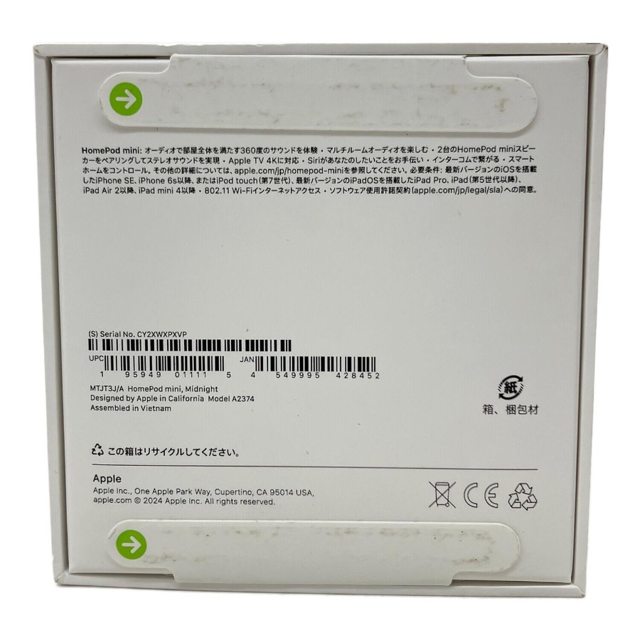 ■商品状態程度S:未使用のお品物こちらの商品は未使用となりますが、検品および撮影のため、外箱や袋を開封することがあります。また、店頭にて展示販売を行っているため記載に無い細かなキズ、ヨゴレが見受けられる場合がございます。■商品説明ブランド:Apple (アップル)アイテム名:HomePod mini型番:MTJT3J/Aタイプ:360度スピーカーJANコード:4549995428452本体サイズ・重量幅x高さx奥行き:97.9x84.3x97.9mm重量:345g仕様バージョン:Bluetooth 5.0ワイヤレス再生:AirPlay、AirPlay 2、無線(Wi-Fi)電源:ACスピーカー構成:フルレンジスピーカー方式:デュアルパッシブラジエータストリーミングサービス(音楽):Apple Music/TuneIn/Podcast機能音声/AIアシスタント機能:Siriマイク:○備考:未開封且未使用品となっております。※非常にデリケートな面を含むお品物となりますため、お客様のもとでメンテナンスや調整などが必要な場合もございます。当社では調整、または費用の負担などはいたしかねますため、中古品という点をご理解の上、ご検討くださいますようお願いいたします。※主観では判断の難しいような僅かなノイズや微細な音量バランスの乱れなどに関しては、中古品という特性上保証致しかねますため予めご了承ください。■付属品本体のみ■その他必ず、商品注文される前に店舗情報に記載している注意事項をご確認ください。