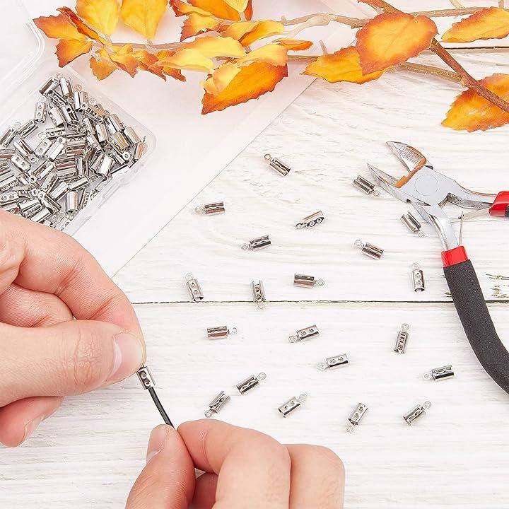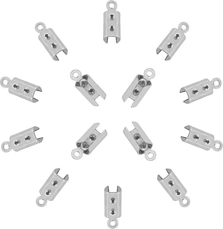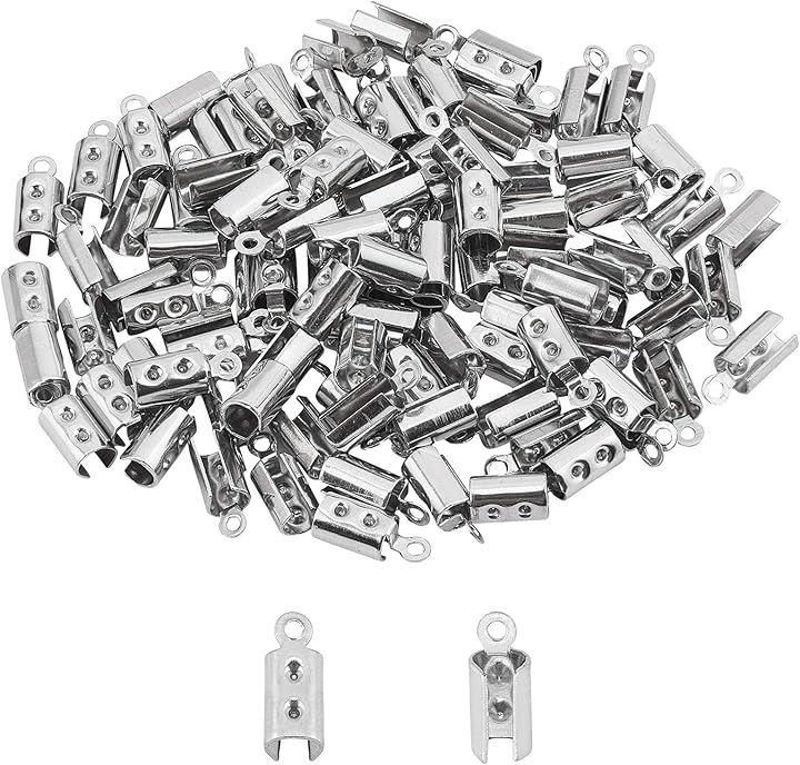 Approximately 100 pieces Stainless steel end parts 304 stainless steel end beads kit Crimp end Fold crimp beads Connection parts set Cord fastener Cord end Terminator Rope buckle Cord fastener Rivet Cord stopper Bracelet end Auxiliary materials