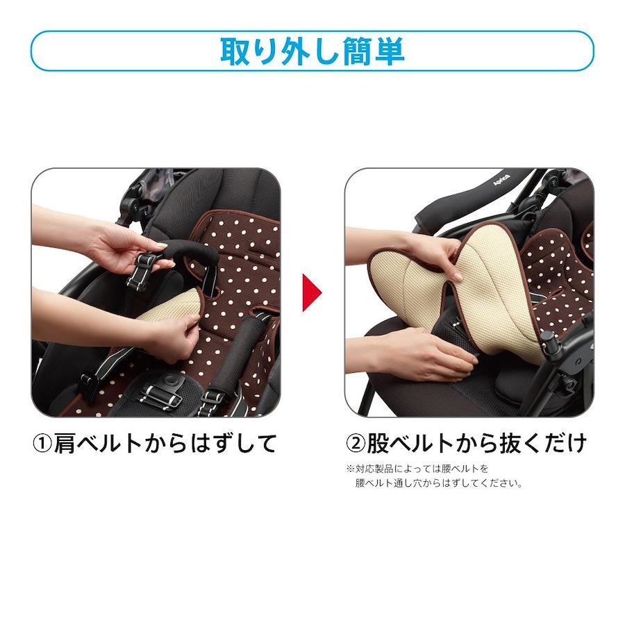 特徴1:取り付け取り外しが簡単!⇒1肩ベルトからさっとはずして⇒2股ベルトから抜くだけ!特徴2:洗濯機で洗える!⇒汗や汚れも洗濯機で洗っていつも清潔にご使用頂けます。特徴3:通気性素材を採用⇒クッション材にメッシュ素材を使用しているので、表と裏の両面に通気性があります。特徴4:汗をすばやく吸収!⇒表地に吸水加工をしているので、汗をすばやく吸収します。特徴5:荒井上がりもすぐ乾く!⇒乾くのが早いので、洗濯後もすぐに使えます。特徴6:リバーシブルシート⇒表地は柄プリント、裏地は無地のメッシュ素材。デザインと素材で使い分けができます。特徴7:燃えにくい素材を使用⇒難燃加工をした燃えにくい素材を採用しているので、チャイルドシートでも使えます。汎用性をご紹介【チャイルドシート】・フラディアグロウ・フラディアシリーズ(ヒップインナーシート、快適フィットマットの併用はできません)・ディアターンシリーズ【ベビーカー】◎アップリカ・ソラリアシリーズ・ラクーナシリーズ・スティックシリーズ・カルーンシリーズ・スムーヴシリーズ・オプティアシリーズ⇒頭・腰マモールパッドと併用可・マジカルエアーシリーズ◎グレコ・シティエースシリーズ・シティライトRシリーズ・シティトレック・シティネクストシリーズ⇒ヘッドサポートと併用可。【ハイローベッド&チェア / ユラリズム】・ユラリズムシリーズ⇒ホールディングパッド及び、ふわふわ立体クッションとの併用不可。⇒ホールディングカバーとの併用可。⇒新生児マットとの併用不可・ココ・チーノシリーズ⇒新生児成長マットとの併用不可。⇒新生児マットとの併用不可。・ニューボーンシリーズ⇒新生児パッドとの併用不可。・ベーシックシリーズ