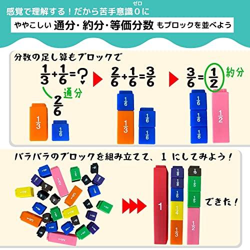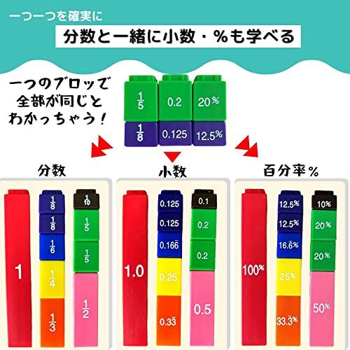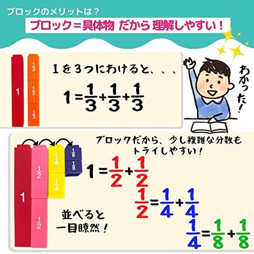 【 分数カードで学ぼう 】 分数の学習には様々なステップがあります。付属の分数カードでは分数の学習を24のステップに分け、それぞれの単元をより深く理解するための問題が用意されています。フルカラーの図解付きで、それぞれのカードにある問いかけにブロックを組み立てたりばらしたりしながら、分数の仕組みを視覚的・感覚的に学ぶことができます。 【 保護者の方向け説明書付き 】 お子様のサポートをしたいけど、説明が難しい…そんなお悩みを解決するため、保護者の方向けの説明書を付属しております。 ステップごとにブロックの使い方を含め、どの点に着目して考察するのかのポイントをまとめてありますのでぜひご活用ください。 【 分数・小数・百分率(%)の換算も 】 このブロックは分数だけではなく、小数・百分率(%)の学習にもご利用いただけます。分数・小数・百分率(%)の換算はいずれも「1」との関係性を理解することに繋がりますが、頭の中だけで理解しようとすると、思考の工程が多くお子様は混乱しがちです。ブロックを使って感覚的に学習することで、思考過程を整理しながらより深い理解につなげることができます。 【 苦手意識を持つ前に 】 小学校高学年の算数で苦手な単元トップ3に「割合」があげられています。分数・小数・百分率(%)は、割合の中でも基礎となる部分です。つまずいたままにしてしまうとその後の学習に大きく影響します。苦手意識を持たないためにも、ご家庭でのフォローに分数ブロックをお役立てください。 【 お子様に合わせた学習 】 分数ブロックをご家庭での学習に活用していただくことで、お子様のペースに合わせた学習が叶います。しっかりと理解できているところはスキップして、わからないところは理解できるまで手と頭を動かしてみることで、より深い学習になります。また、学校では多くのお友達の中で授業が進むため、「?」と思っても先生に質問することができないことがほとんどです。年齢的にも質問が恥ずかしいという気持ちが始まります。ご家庭での予習・復習に、お子様ご自身がじっくりと考えられる、分数ブロックをお役立てください。