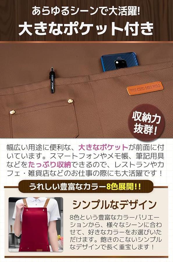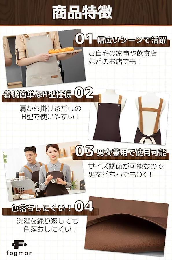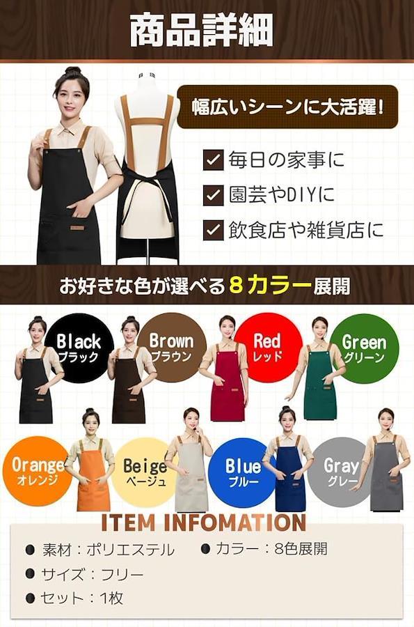 「商品特徴」(1)幅広いシーンで活躍:ご自宅の家事や飲食店などのお店でも。/(2)着脱簡単なH型仕様:肩から掛けるだけのH型で使いやすい。/(3)男女兼用で使用可能:サイズ調節が可能なので男女どちらでもOK。/(4)色落ちしにくい。:洗濯を繰り返しても色落ちしにくい。