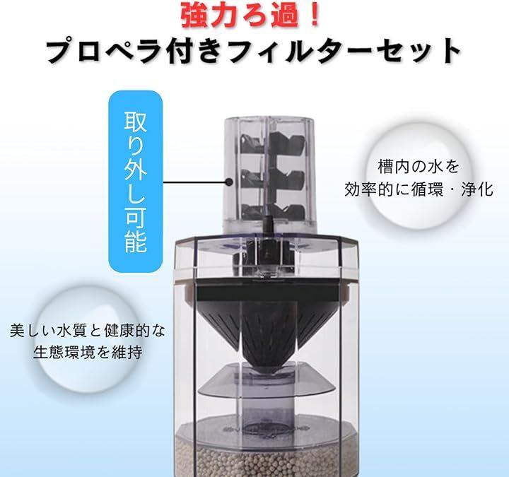 「強力ろ過。プロペラ付きフィルターセット」水槽内の水を効率的に循環・浄化するプロペラフィン付きパワーフィルター。