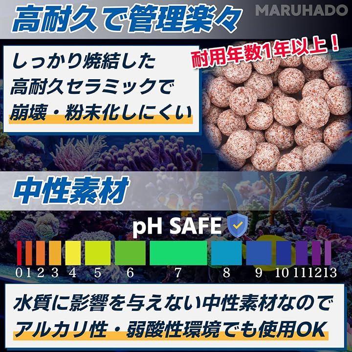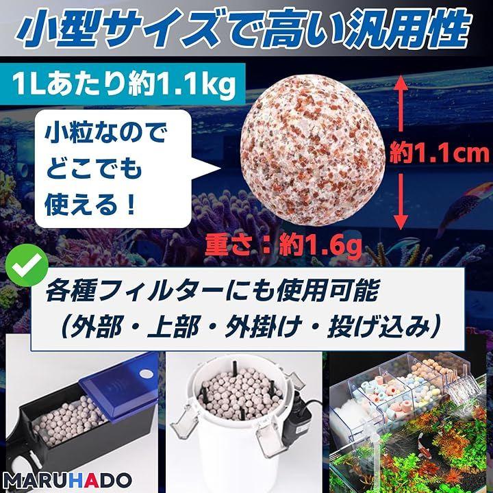 「どんな水槽にも使いやすい」沈下性のある直径1cm程度の小粒ボール型なので、各種フィルター(外部・上部・外掛け・投げ込み・底面)や、魚池・床材としても設置でき、淡水・海水にも対応しています。