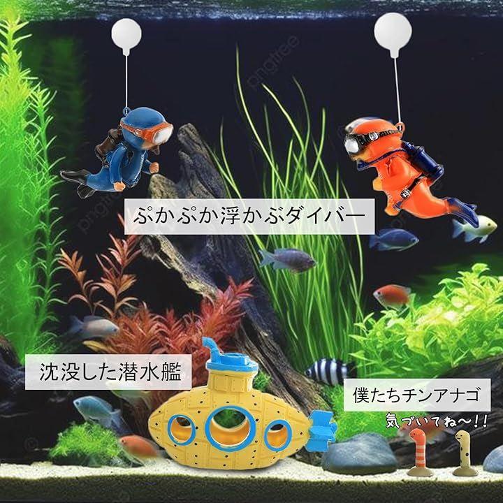 アクアリウムの景色を一変させる、まるで映画のワンシーンのような水中世界をあなたの水槽に。可愛らしいダイバーがゆらゆらと浮遊し、かわいい潜水艦が魚たちの隠れ家や秘密基地に。