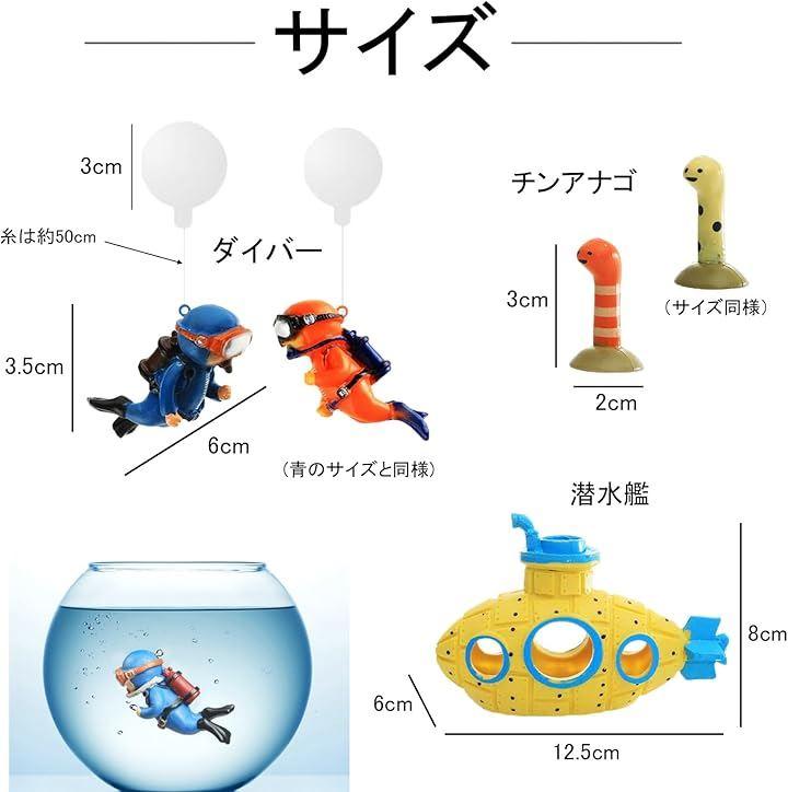 「うちの水槽に合うかな?」「設置は難しい?」といった心配は不要です。ダイバーは付属の糸で風船と縛るだけ、潜水艦とチンアナゴは置くだけ。