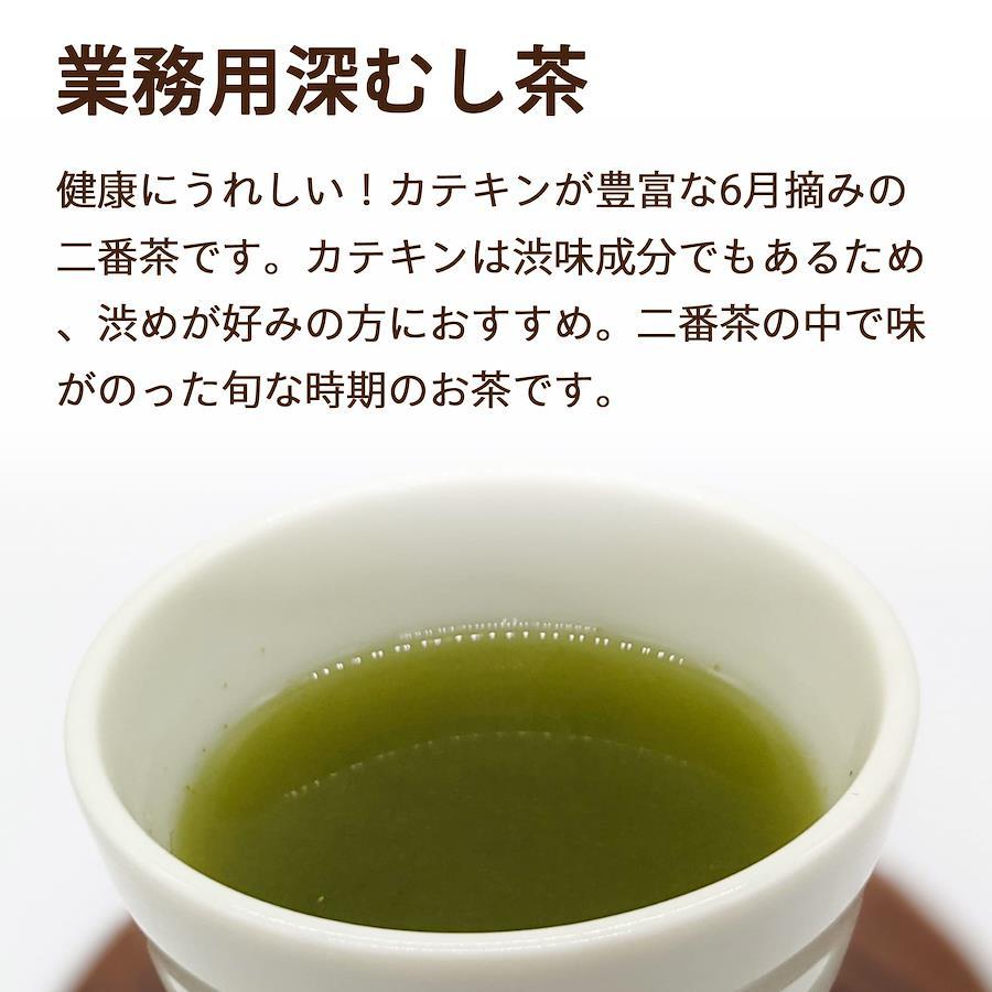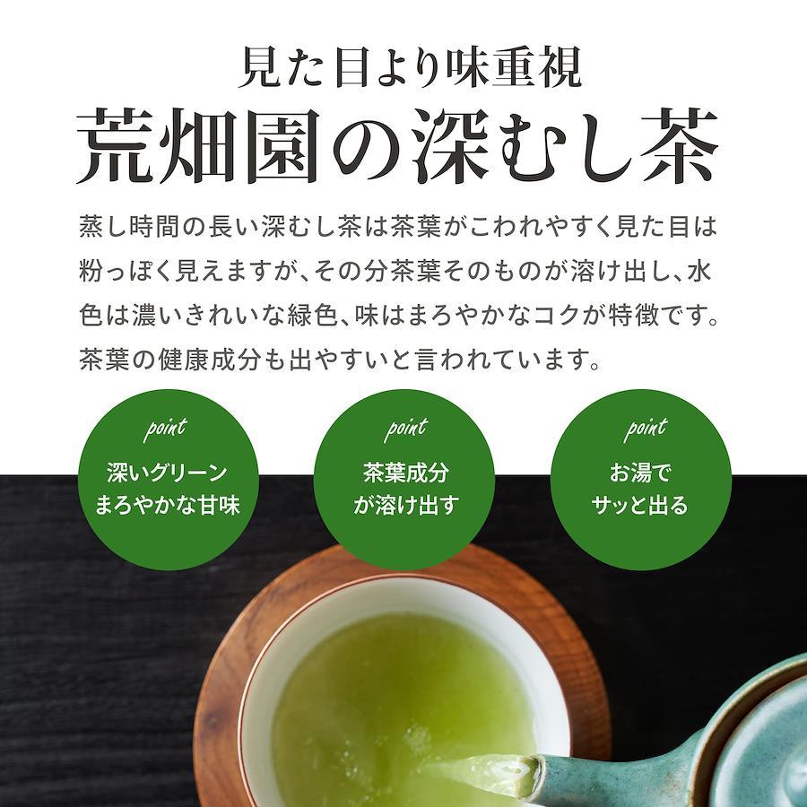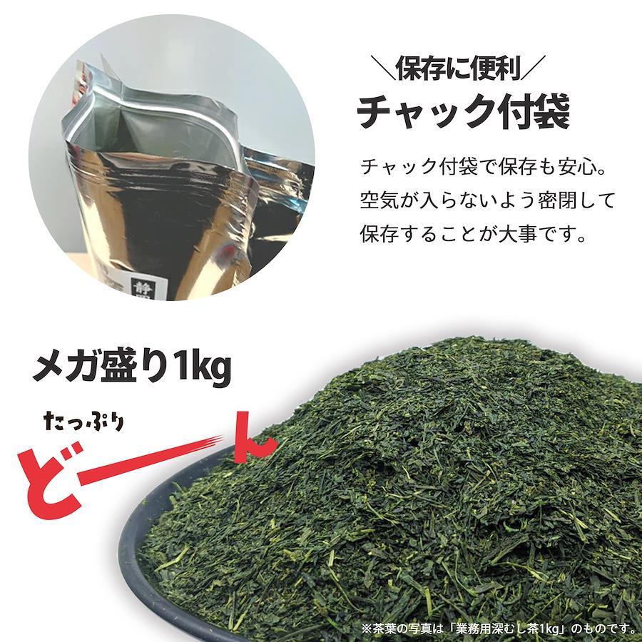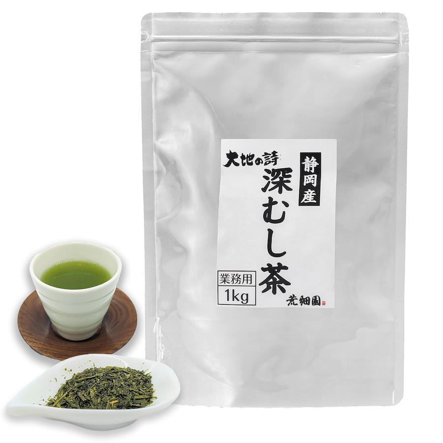 【二番茶】原材料:緑茶(静岡産)内容量:1kg一般的な煎茶(茶葉の抽出液)に対し深むし製法では茶葉そのものが溶け出します。水色、旨みに加え茶葉の健康成分もたっぷり溶け出しています。茶葉は細かくなり、見た目は良くありませんが茶葉の形状より「味を重視」したのが深むし茶なのです。 業務用深むし茶は6月摘みの二番茶を使用。二番茶は一番に摘んだ茶葉に比べ健康にうれしいカテキンが豊富です。カテキンは渋味成分でもあるため、渋めが好みの方にはおすすめです。さらに、荒茶から出物(粉・茎など)を除きお茶の葉のみを選別。いわゆる本茶です。上質の茶葉を活かす深むし製法:荒畑園のお茶は普通煎茶の三~四倍長く茶葉を蒸す深むし製法でつくった「深むし茶」です。牧之原台地は日照時間が長く、肉厚で栄養たっぷりな茶葉が育ちます。この茶葉を長く蒸すことで、タンニン(苦渋味)含量が減り、アミノ酸のテアニン(甘み)が増してまろやかなお茶に仕上がります。茶葉は細かくなりますが、きれいな深いグリーン、まろやかな甘味と深いコクが特徴です。【免責事項】メーカーによる商品リニューアルに伴いパッケージ(内容量も含む)変更が行われた場合、新パッケージでお届け致します事ご了承願います。
