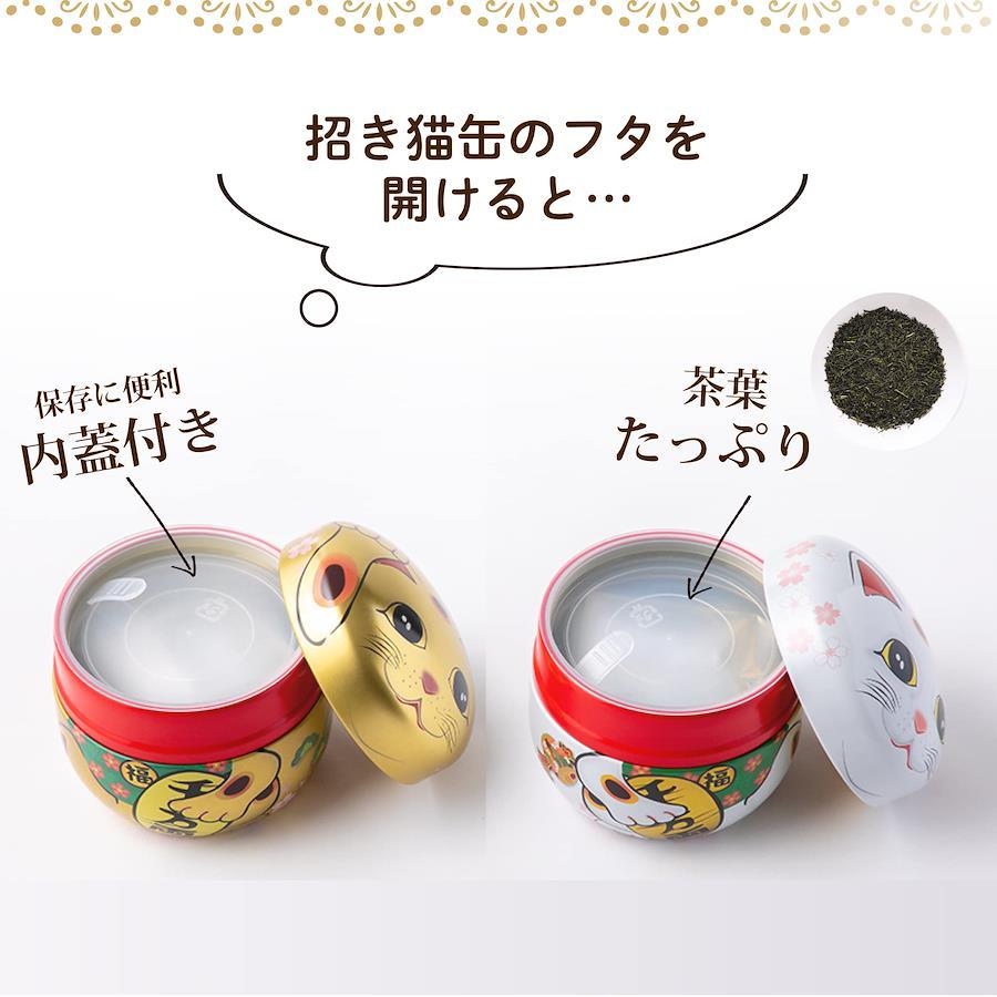 原材料:緑茶(静岡県産)内容量:80g×2缶 可愛らしい招き猫の贈り物招き猫は江戸の昔よりお金や人を招いてくれる縁起物として親しまれてきました。 右手を挙げている招き猫は金運や幸運を招き、 左手を挙げている招き猫は千客万来といってお客様を招くと言われています。 商売繁盛、開店祝い、結婚祝い、定年祝いなど幸運が訪れるよう願いをこめて… 贈り物や自分使いにいかかでしょうか。【荒畑園の深蒸し茶】上質の茶葉を活かす深むし製法:荒畑園のお茶は普通煎茶の三~四倍長く茶葉を蒸す深むし製法でつくった「深むし茶」です。【牧之原台地のお茶】牧之原台地は日照時間が長く、肉厚で栄養たっぷりな茶葉が育ちます。この茶葉を長く蒸すことで、タンニン(苦渋味)含量が減り、アミノ酸のテアニン(甘み)が増してまろやかなお茶に仕上がります。茶葉は細かくなりますが、きれいな深いグリーン、まろやかな甘味と深いコクが特徴です。【土へのこだわり】荒畑園では「力のある茶樹から摘み取った肉厚で緑の濃い茶葉からこそ、旨いお茶ができる」と考え、土づくりからお茶の栽培に取り組んでいます。【自然還元農法 もみがら堆肥】毎年秋にもみがらと米ぬか、菜種粕などを土壌有効微生物菌と共に発酵させたもみがら堆肥作りを行います。この旨味成分たっぷりのもみがら堆肥を広大な畑に均一に撒き、土中に微生物を増殖させ、土壌を豊かにし、地力をつける自然還元農法です。【世界農業遺産 静岡の茶草場農法】茶草場は茶園に有機物として投入するササやススキ等の草を刈り取る半自然草地です。静岡県ではよく見られる風景です。茶草場から刈り取った草を茶園に敷く農法はより高品質なお茶を生産します。そしてこの営みが自然界の仕組を崩すことなく、生物との共生を営むのです。※静岡の茶草場農法は平成25年5月30日に国際連合食糧農業機関(FAO)より世界農業遺産に認定されました。【重要】ギフト発送するお客様へ:購入者様ご本人以外の方へ発送をする場合、ギフトの設定をお選びください。【免責事項】メーカーによる商品リニューアルに伴いパッケージ(内容量も含む)変更が行われた場合、新パッケージでお届け致します事ご了承願います。