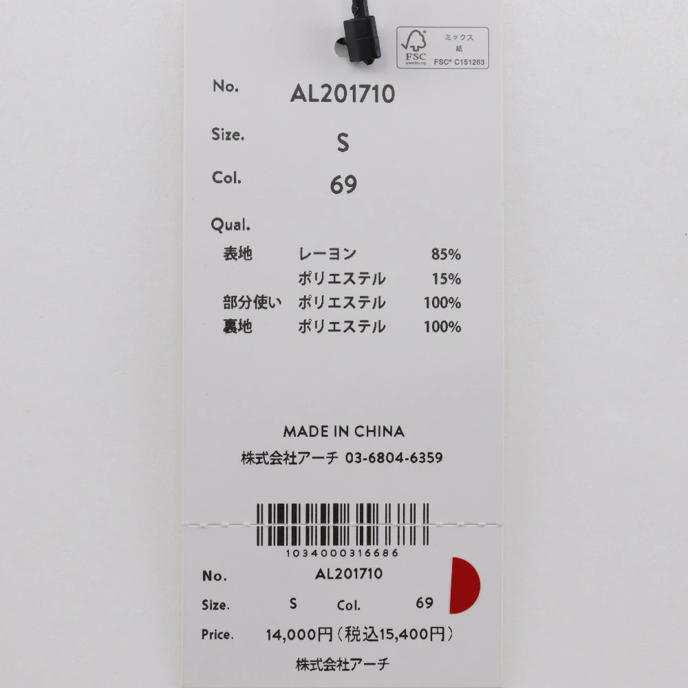 | 詳細備考 | ・素材:(生地)レーヨン85% ポリエステル15% (部分使い)ポリエステル100% (裏地)ポリエステル100% ・生産国:ベトナム |