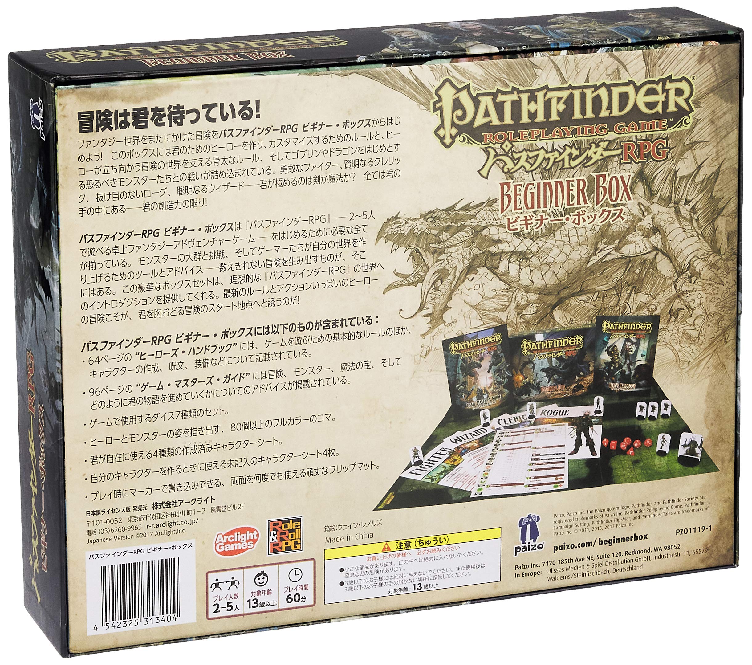 プレイヤーは自分の分身であるキャラクターを作成し、それを操って『パスファインダーRPG』の世界を冒険します。あるときは未開のダンジョンを探索し、またあるときは街を守るためにゴブリンたちに立ち向かいます。数々の試練を潜り抜け、ヒーローとなりましょう。ビギナー・ボックスには、『パスファインダーRPG』で遊ぶために必要な次のものが入っています。・ゲームの基本ルールのほか、呪文、装備などのデータ・ゲームマスターをする上でのアドバイスや、モンスター・魔法の宝などのデータ・ゲームで使用するダイス7種類のセット・80個以上のフルカラーのコマ・4種類の作成済みキャラクター・キャラクターの作成方法とキャラクターシート・書き込み可能なフリップマットさあ、すべての準備を整え、仲間とともに『パスファインダーRPG』の世界を駆け回りましょう。プレイ人数:2~5人プレイ時間:60分対象年齢:13歳以上原題:Pathfinder Roleplaying Game -Beginner Box[セット内容]ヒーローズ・ハンドブック1冊、ゲーム・マスターズ・ガイド1冊、ダイス7種類、コマ(ヒーロー、モンスター)およびコマ立て80セット以上、作成済みキャラクターシート4種類、キャラクターシート4枚、フリップマット1枚(.co.jpより) プレイ人数:2~5人 プレイ時間:60分 対象年齢:13歳以上 プレイヤーは自分の分身であるキャラクターを作成し、それを操って『パスファインダーRPG』の世界を冒険します。 あるときは未開のダンジョンを探索し、またあるときは街を守るためにゴブリンたちに立ち向かいます。