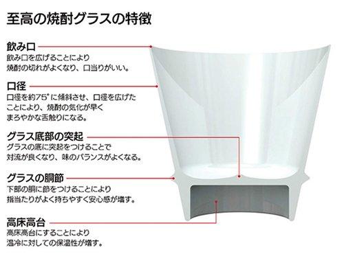 ●そしてそのグラスは、そんな素材の良さのみならず、試行錯誤を重ねた末に完成したそのフォルムによって、至高というコピーも納得の出来映えになっている。広口にしたことにより焼酎の気化が早くなり、まろやかな舌触りになるという特徴はそのひとつ。他にも、対流を促進して味のバランスを良くするグラス底部の突起や、保温性を増すための高床高台など、なる