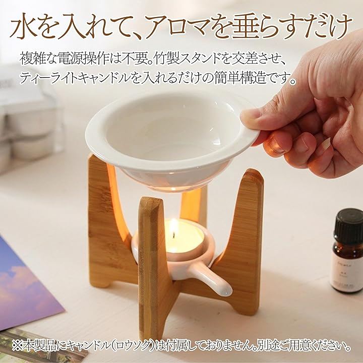 ティーライトキャンドルと精油を使うだけの簡単設計で、心地よい香りがリビングや寝室に穏やかに広がり、仕事後のリラックスや就寝前の安眠をサポート。