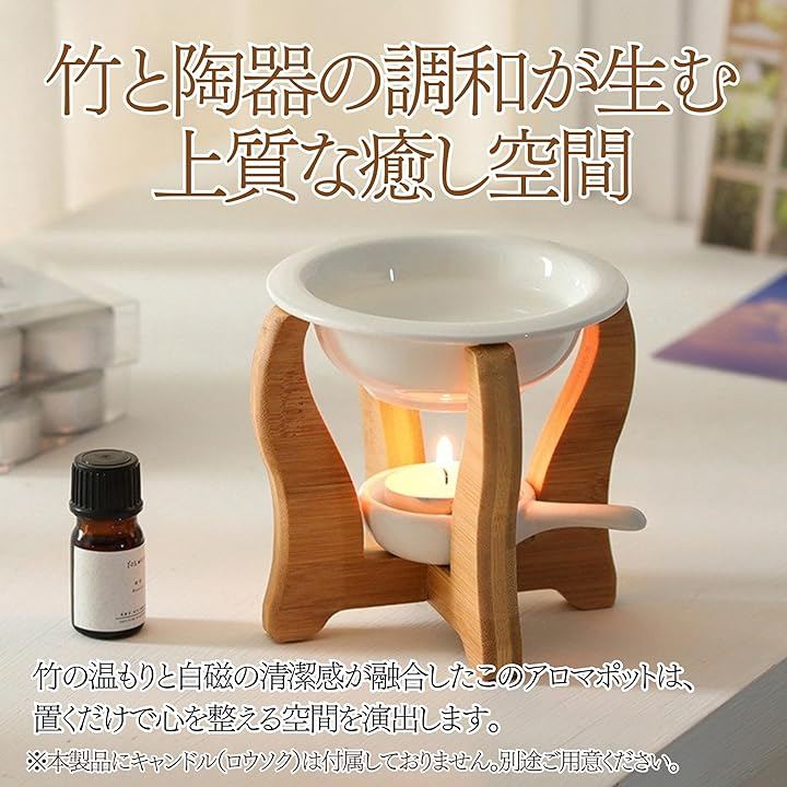 「竹と陶器の調和が生む上質な癒し空間」 忙しい日常で「落ち着く時間がない」と感じていませんか? 竹の温もりと白磁の清潔感が融合したこのアロマポットは、置くだけで心を整える空間を演出します。