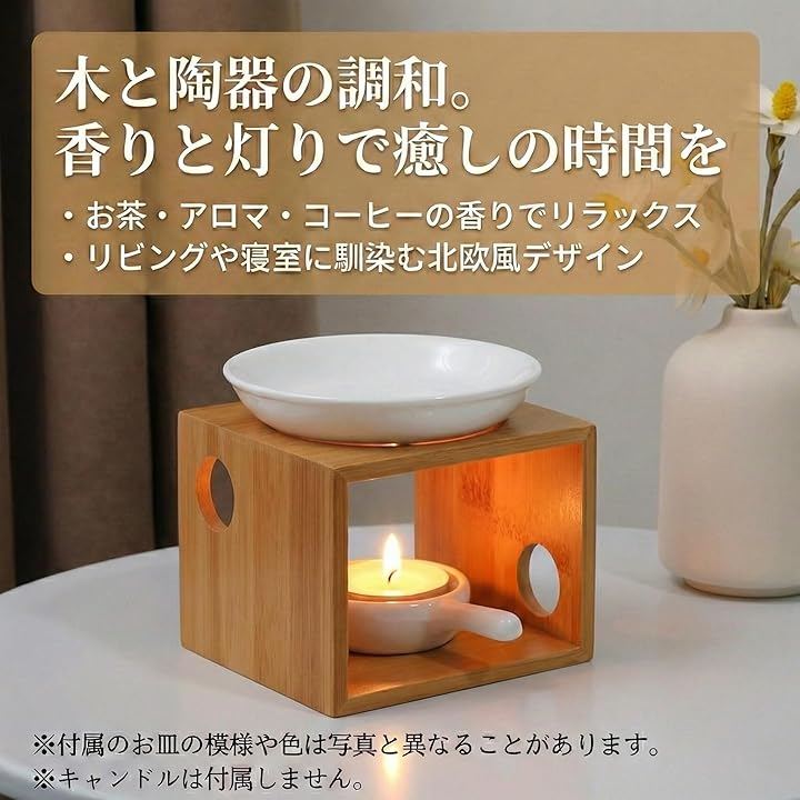 木の温もりと陶器の質感が調和した上質デザインのアロマポットは、キャンドルの灯りとお茶・アロマオイル・コーヒー粉などの香りで気分を整え、忙しい日常の中でも手軽にリラックス空間を演出できます。