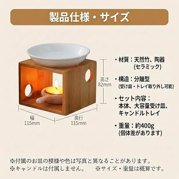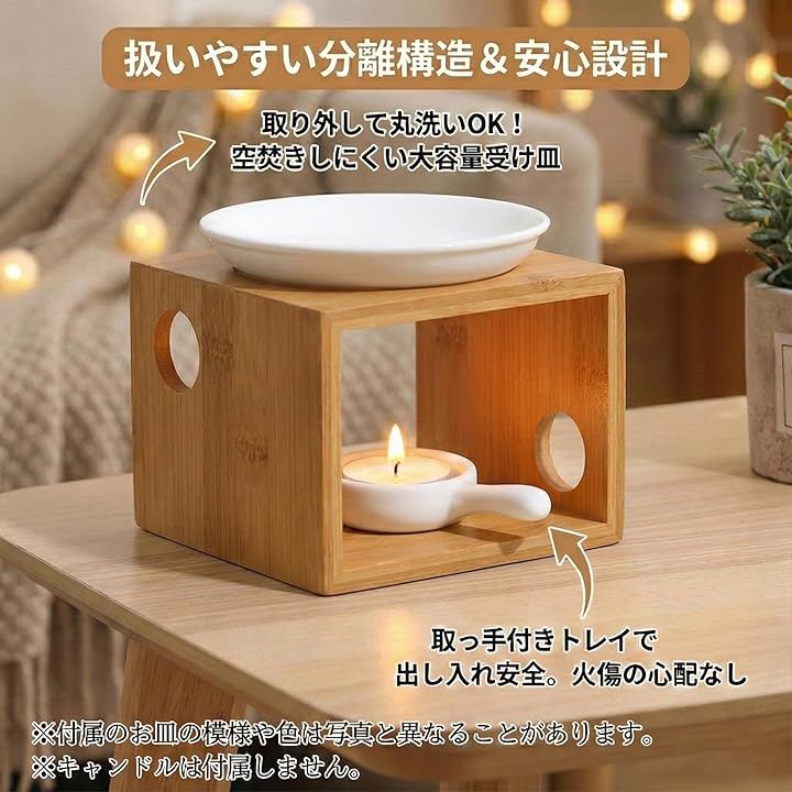 受け皿が取り外せる分離構造で扱いやすく、キャンドルトレイ付きで火傷リスクを軽減しつつ長時間使用可能な大容量設計のため、就寝前や読書時間にも最適。