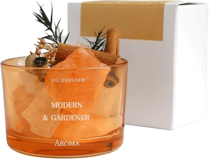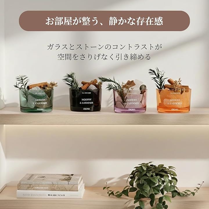 「 ガラスx天然石の上質デザイン」 透明感のあるガラス容器の中で天然石アロマストーンが重なり合い、光で表情が変わるインテリア性の高いアイテム。