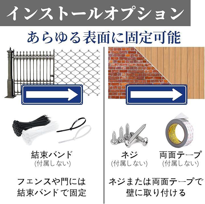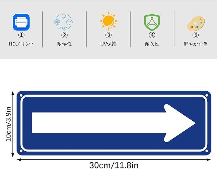 「商品仕様」サイズ:300x100mm、厚さ:0.85mm、材質:アルミ製看板、セット内容:2枚入り。