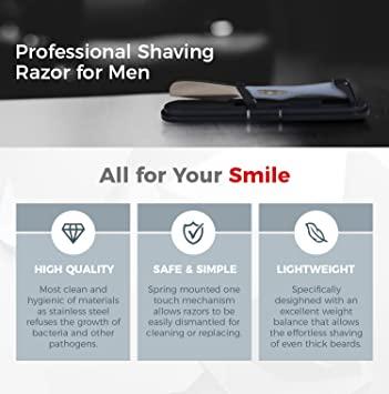 本体には最高級のステンレス鋼を使用、耐薬品性や防錆力が大幅に向上。日本剃刀のハンドルはエラストマー樹脂(耐熱温度135℃)製。替刃装着部はワンタッチのバネ式(特許)を採用。分解・組立が簡単に行えます。