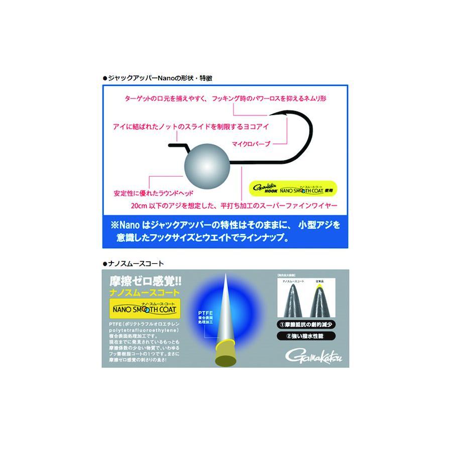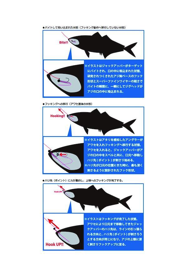 ジャックアッパーの鋭く刺さるフッキング性能はそのままに、対小型アジ用にリファインされたジグヘッドです。フックポイントからアイまでの距離を長めに設けたロングシャンクは、小型アジの弱いバイトでも吸い込まれやすい設計になってます。また(株)がまかつ社の複合表面処理加工の「ナノスムースコート」を施した極細線径のスーパーファインワイヤーは、まさに摩擦ゼロ感覚の刺さりの良さを実現します。小型アジ以外にも、キスやハゼなどの20cm以下のターゲットを対象にした、様々なライトゲームシーンでその威力を発揮します。
