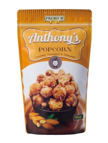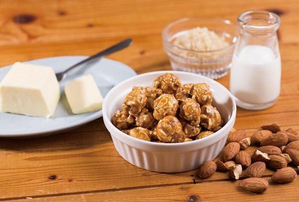 ノンオイルの「エアーポップ製法」でコーンを弾けさせ、銅鍋でトロトロに煮込んだキャラメルにこんがりローストした皮付きクラッシュアーモンドを加えた蜜でコーティングしました。