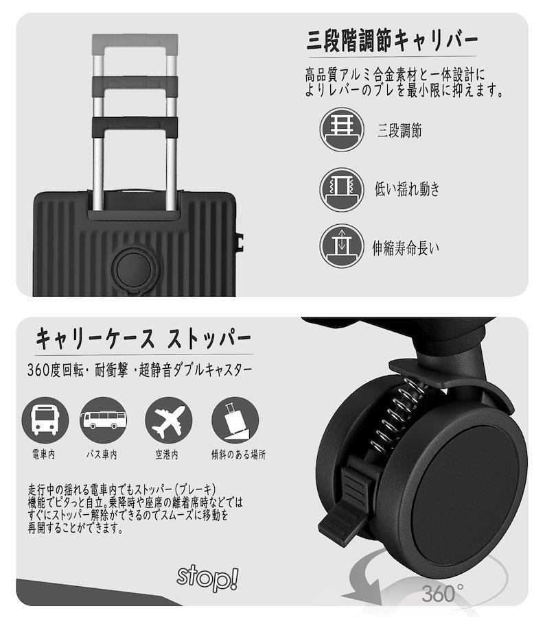 【キャスター ストッパー付き 、USB+Type C充電ポート付き 、 カップホルダーとスマホルダーを付く】 ASHARDフロントオープンシリーズのバージョンアップモデルです。走行中の揺れる電車内でもストッパー(ブレーキ)機能でピタっと自立。乗降時や座席の離着席時などではすぐにストッパー解除ができるのでスムーズに移動を再開することができます。スーツケースにモバイルバッテリーを収納するポケットがついており、 USB+Type Cポートの充電口が外にあることで、いつでもどこでも充電できます。便利な折りたたみ式ドリンクホルダー付き。バックカップホルダー、ミルクティーカップ、傘いつでも配置でき、旅行をより便利にすることができます。レバーの上部にはスマホルダーが付いているので、フライトの待ち時間に両手が自由になり、外出先でもリラックスできます。 【多機能フロントカバーデザイン&合理的な仕切りデザイン】Sサイズ:12.9インチのiPadまたはメガネケース、スナック、ペットボトルを収納。Mサイズ:15.1インチのノートパソコン、メガネケース、スナック、ペットボトルが収納可能。Lサイズ:15.1インチのノートパソコン、メガネケース、スナック、ペットボトルを収納できます。高品質のポリエステル生地で、柔らかいかつ快適です。密閉されたU字型コンパートメントは荷崩れ防止だけでなくプライバシー保護効果もあります。メッシュポケットにより、収納しにくい小物でもは一目でわかります。X型ベルトが完備され、荷物崩れを完全防止。収納力抜群、たくさんの小物を入れることはできます。 【丈夫かつ軽いPC素材&TSAダイヤル式ロック】表面素材は高耐衝撃性を持つPC(ポリカーボネート)を100%使用。高弾性で、変形しにくい。ABS素材を採用した市販品より頑丈で耐久性に優れ、ABS+PCスーツケースより軽量で持ち運びやすい。PC 素材は、現在市場で最も一般的に使用され人気のあるハードシェル ラゲッジであり、防水性、耐摩耗性、スタイリッシュさ、耐衝撃性、落下耐性を備えています。世界基準のTSAダイヤル式ロックが搭載されて、外出がより安全に。※鍵は航空会社検査専用のため本製品には付属しておりません。 【360度回転 耐衝撃静音ダブルキャスター】高弾性TPE衝撃軽減素材のキャスターを採用し、より静かで耐摩耗性も向上しています。スムーズな滑りを実現しながら、360度の自由回転もできます。ダブルキャスターデザイン、旅先での移動をよりリラックスで快適になります。角部に硬質コーナープロテクトを追加、衝撃を効率的に吸収でき、より長くご利用いただけます。 【サイズ】Sサイズの外寸は54.5*35*23cm、重さ:3.39kg 超軽容量、は42リットル、1~3泊に似合います。Sサイズは一部の航空会社だけに適用しますので、事前に航空会社に確認したほうがいいんです。Mサイズの外寸は64*43*26cm、重さ:4.19kg 、容量は65リットル、4~7泊以上。Lサイズの外寸は73*48*30cm、重さ:5.14kg、 容量は97リットル、7泊以上 【1年間無料保証】商品到着後(30日内)、誤配送・破損・故障等の問題がございましたら、早急に出品店舗へとご連絡ください。返品、返金、交換などを承ります。 ※画像と実物のカラーにつきまして、全品スタジオ撮影素材を使用しておりますが、お客様のデバイスやデバイスの設定によって見え方が変わる場合がありイメージと若干異なる場合もございます。