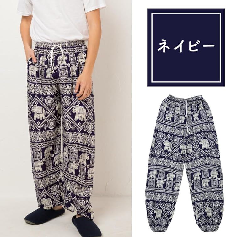 Asian-style harem pants for men, ethnic elephant print, long length, loungewear, elastic waistband, drawstring, pockets, rayon, all-over print.