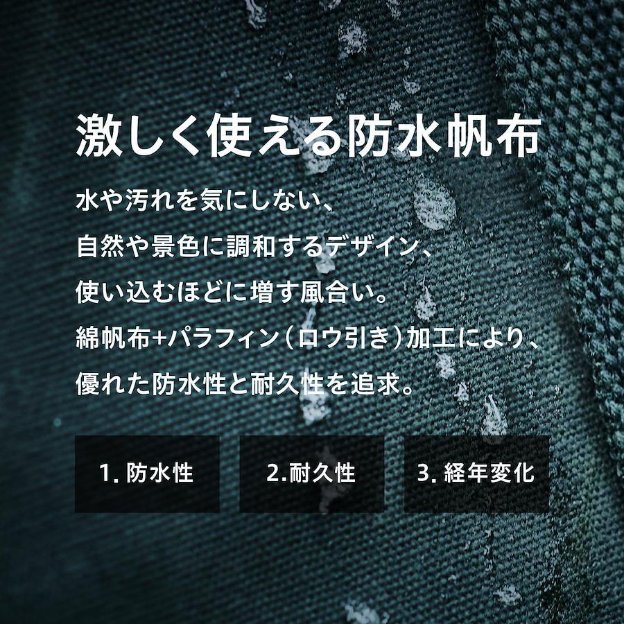 サイズ:高さ21×幅30×奥行4cm材質:本体/コットン(パラフィン加工)、テープ/ポリエステル、ネーム/革重量:200g●フラップ付前面ポケット:W30×H16cm ●ハトメ付きテープ:W4.5×H2.5cm ●側面ループ:全長4cm