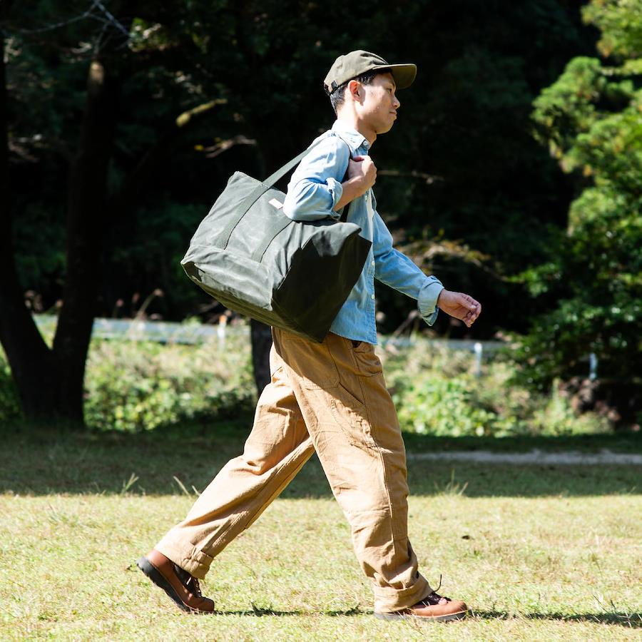 サイズ:高さ33×幅39×奥行29cm材質:本体/コットン(パラフィン加工)、テープ/ポリエステル、ネーム/革重量:460g●持ち手:54cm ●耐荷重:20kg