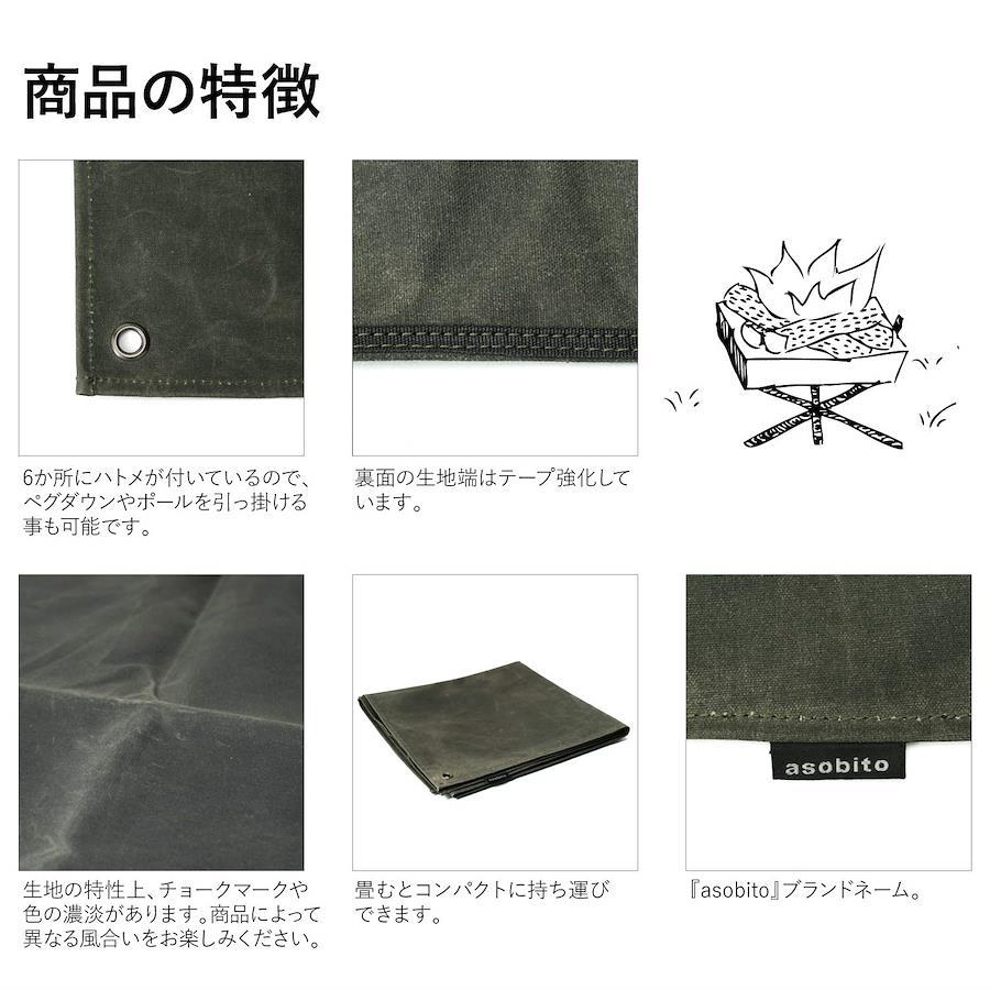 サイズ :奥行70×幅138cm材質:100%綿帆布(天然素材)重量:580gasobitoのこだわり1:帆布には化繊を使ったものもありますが、綿帆布は、天然素材ならではの表情や風合い、使い込むほどに味わい深い経年変化を楽しむことができる、「例え少々擦り切れることがあっても使い続けたい」と思える素材とその世界観を大切にしています。asobitoのこだわり2:独自の特殊なパラフィン加工により、他社製品と比較し、深みのある色味や風合い、ハリ感を実現し、無骨な質感を追求しています。また防水性に優れており、高密度な綿帆布に独自のパラフィン加工をすることで、泥汚れや水濡れを気にせず使えます。