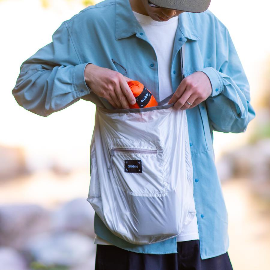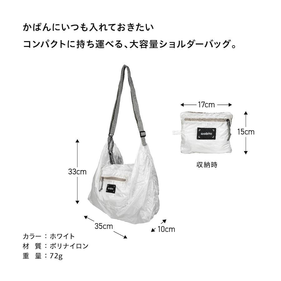 「asobito(アソビト) パッカブルショルダーバッグ」かばんにいつも入れておきたい、コンパクトに持ち運べる大容量ショルダーバッグ。・収納時は手のひらに収まるサイズ。・フロントポケットで小物が収納可能。・内側には小物が入る便利な内ポケット付き。