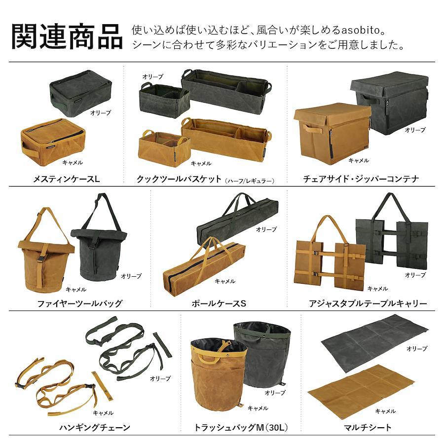 サイズ:高さ14×幅40.5×奥行13cm材質:100%綿帆布(天然素材)重量:720gasobitoのこだわり1:帆布には化繊を使ったものもありますが、綿帆布は、天然素材ならではの表情や風合い、使い込むほどに味わい深い経年変化を楽しむことができる、「例え少々擦り切れることがあっても使い続けたい」と思える素材とその世界観を大切にしています。asobitoのこだわり2:独自の特殊なパラフィン加工により、他社製品と比較し、深みのある色味や風合い、ハリ感を実現し、無骨な質感を追求しています。また防水性に優れており、高密度な綿帆布に独自のパラフィン加工をすることで、泥汚れや水濡れを気にせず使えます。