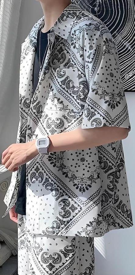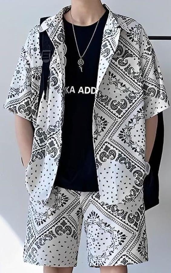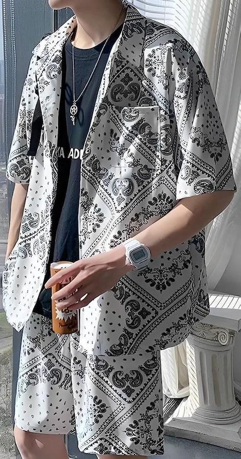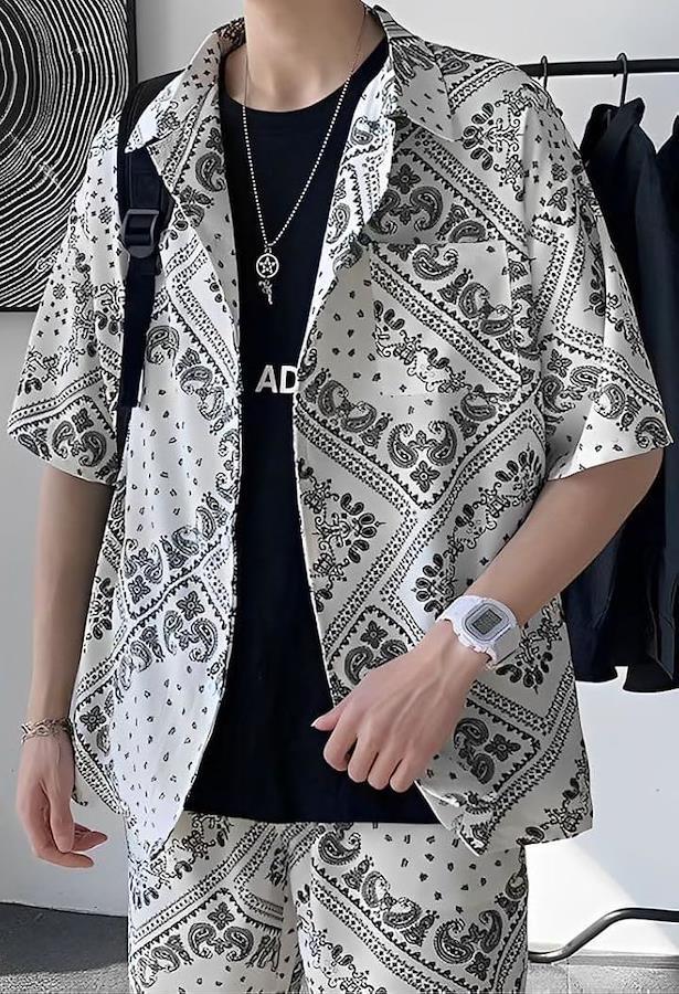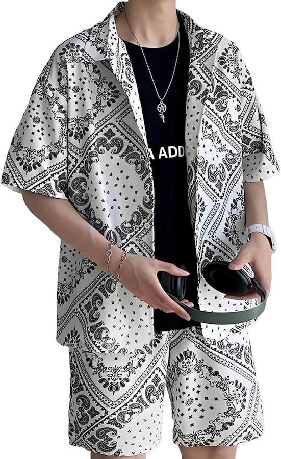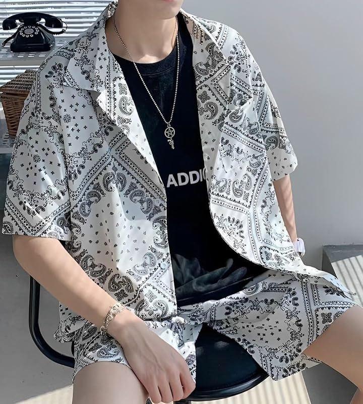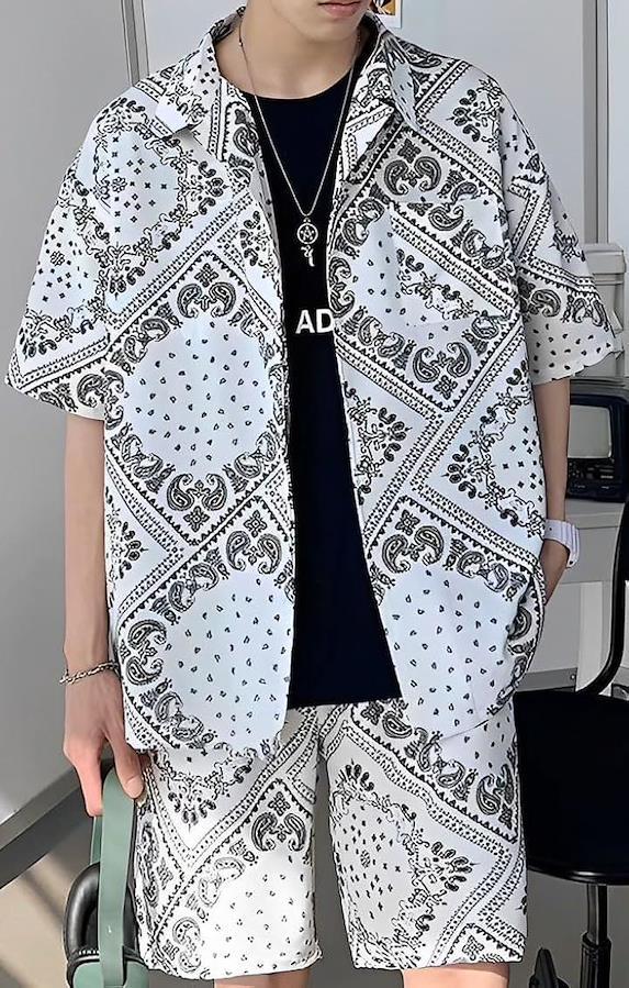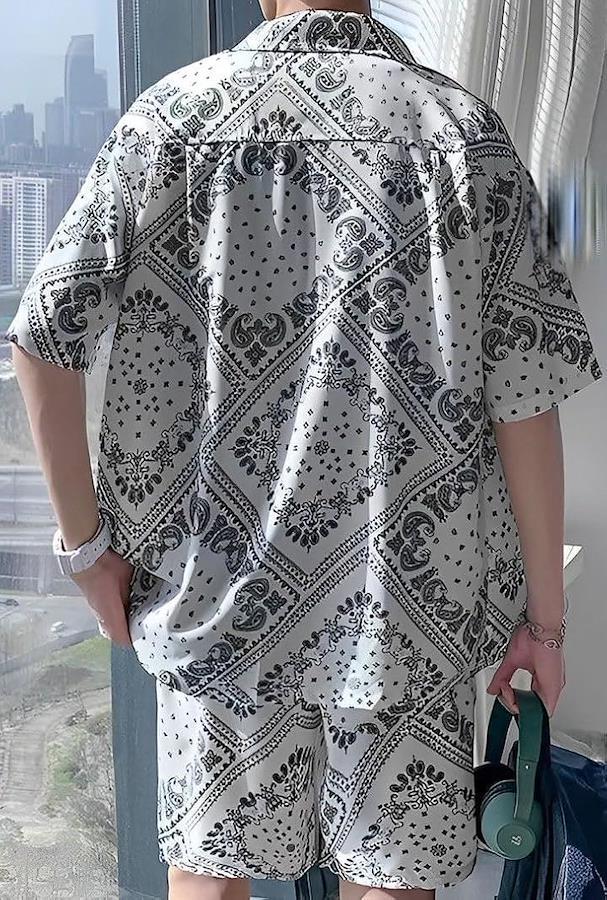 Aspersio Paisley pattern short sleeve shorts top and bottom set Street style collared shirt shorts men's short sleeve set setup 2 piece set patterned shirt patterned outdoor