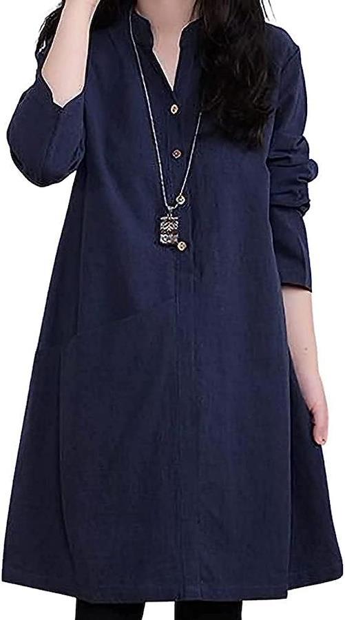 清涼感のあるミニ丈シャツワンピースシンプルなスキッパーワンピは身体のラインが程よく体型カバーできる、フェミニンなシルエットで仕立てましたひざ丈寄りのロングな丈感がさらにオトナの女性らしさを際立てますすっきりと開いたスキッパー衿が抜け感をプラス**前開き襟がさわやかなイメージでロングシーズンで長く着まわせる1枚フレアータックで動きのあるaラインシルエットはプルオーバータイプなのですっぽりかぶるだけで、スッキリ見える1枚です裾部分にはタックをあしらったさりげないボリュームシルエットがポイント1枚で着るのはもちろんスキニーパンツやタイツと合わせてチュニックワンピ風に着るのもオススメ「サイズ」 「Mサイズ 胸囲:45cm 着丈:78.5cm 肩幅:35cm 袖丈:56cm 裾幅:53cm 」「Lサイズ 胸囲:47cm 着丈:79cm 肩幅:35cm 袖丈:56.5cm 裾幅:54cm 」「XLサイズ 胸囲:49cm 着丈:80cm 肩幅:35cm 袖丈:56.5cm 裾幅:54cm 」「2XLサイズ 胸囲:50cm 着丈:81cm 肩幅:36cm 袖丈:57.5cm 裾幅:57cm 」「3XLサイズ 胸囲:54cm 着丈:81.5cm 肩幅:38cm 袖丈:57.5cm 裾幅:59cm 」「4XLサイズ 胸囲:54.5cm 着丈:82.5cm 肩幅:40cm 袖丈:58.5cm 裾幅:63cm 」*寸法は実物を平置きにて採寸しております。