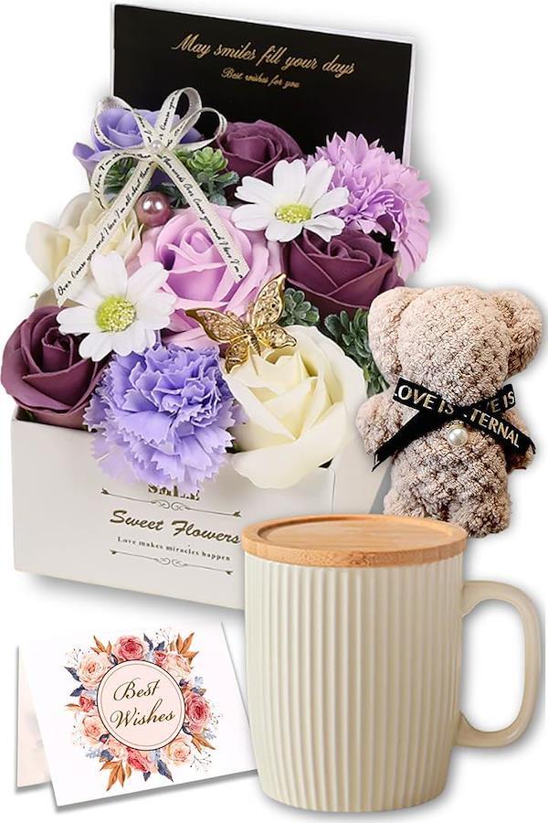 内容は、(1)お花(ソープフラワー)と、(2)蓋付きマグカップ(電子レンジ対応可)と、(3)クマの形に成形した可愛いハンドタオルの3点で、メッセージカードを付属しています 黒いダンボール箱に頑丈に梱包してお届けします。