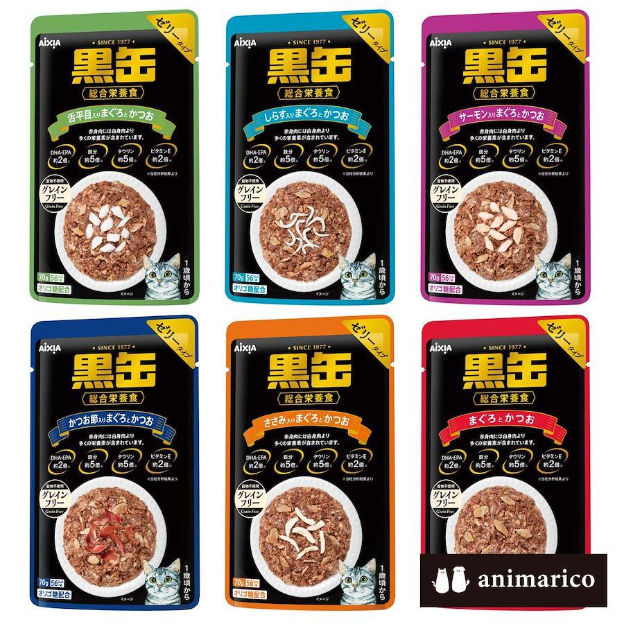 まぐろとかつお/しらす入り/ささみ入り/かつお節入り/舌平目入り/サーモン入り/黒缶パウチ6種お試しセット。愛猫の好みの味をお探しください?まぐろとかつおの赤身肉ベースの総合栄養食。DHA、EPA、鉄分、タウリン、ビタミンEを含むまぐろとかつおの赤身肉ベースの総合栄養食。原材料は穀物不使用だから穀物が苦手な猫も安心。