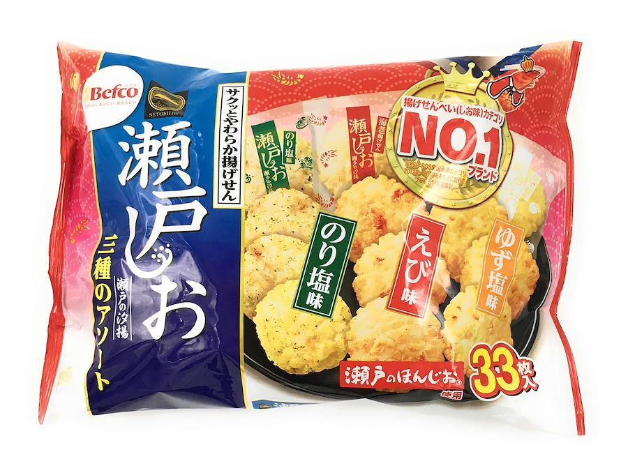 「栗山米菓 瀬戸の汐揚アソート 33枚入」「瀬戸の汐揚」のレギュラー品のえび味、のり塩味に、新しくゆず塩味を加えた三種のアソートとして、ご要望の多かった大袋商品を商品化しました。