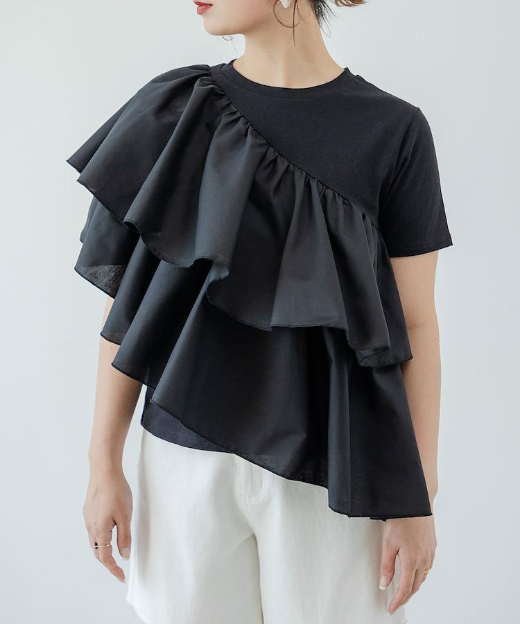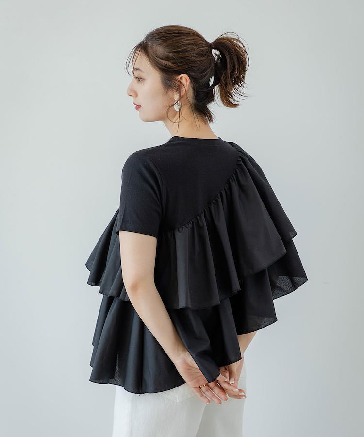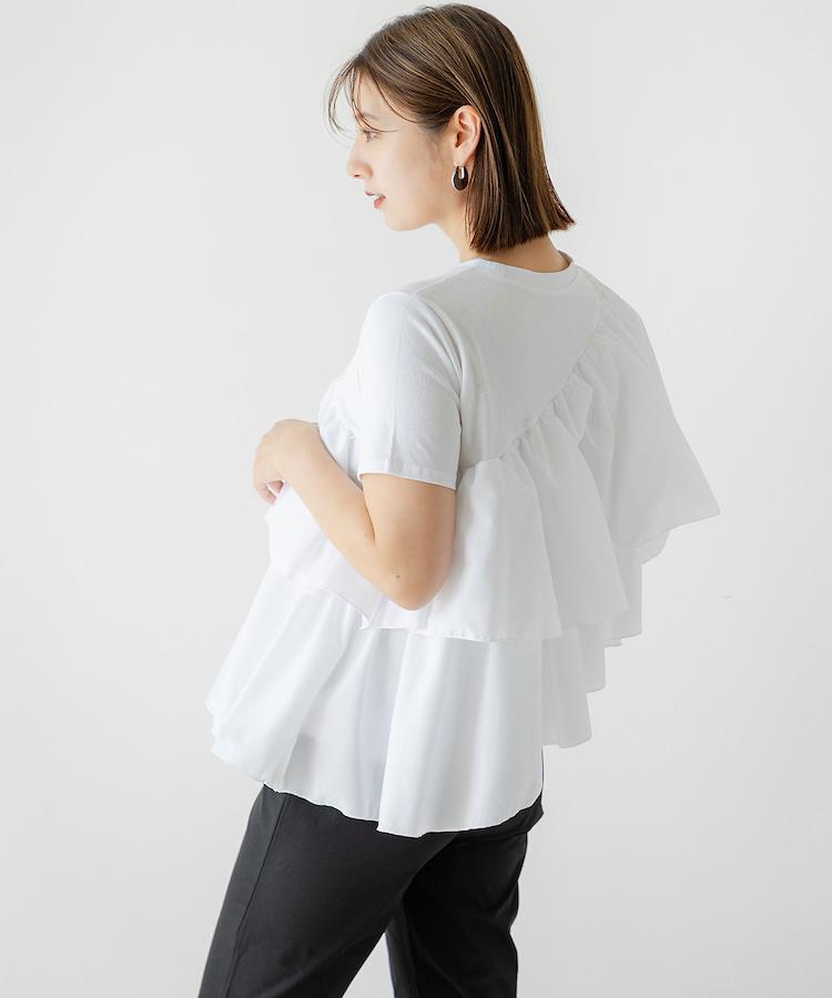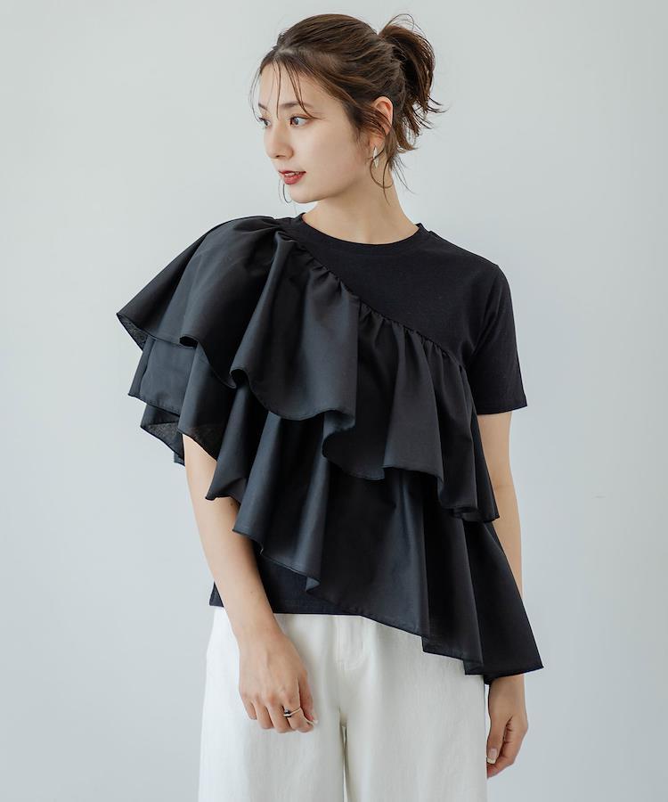 一枚で顔まわりが華やぐ、シンプルなTシャツにラッフルフリルをドッキングさせたトップス。