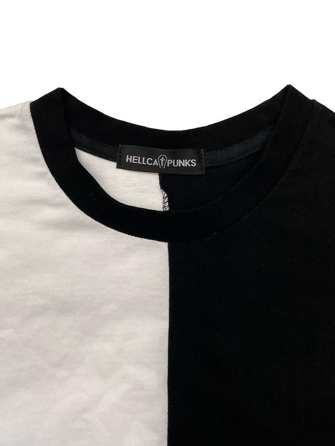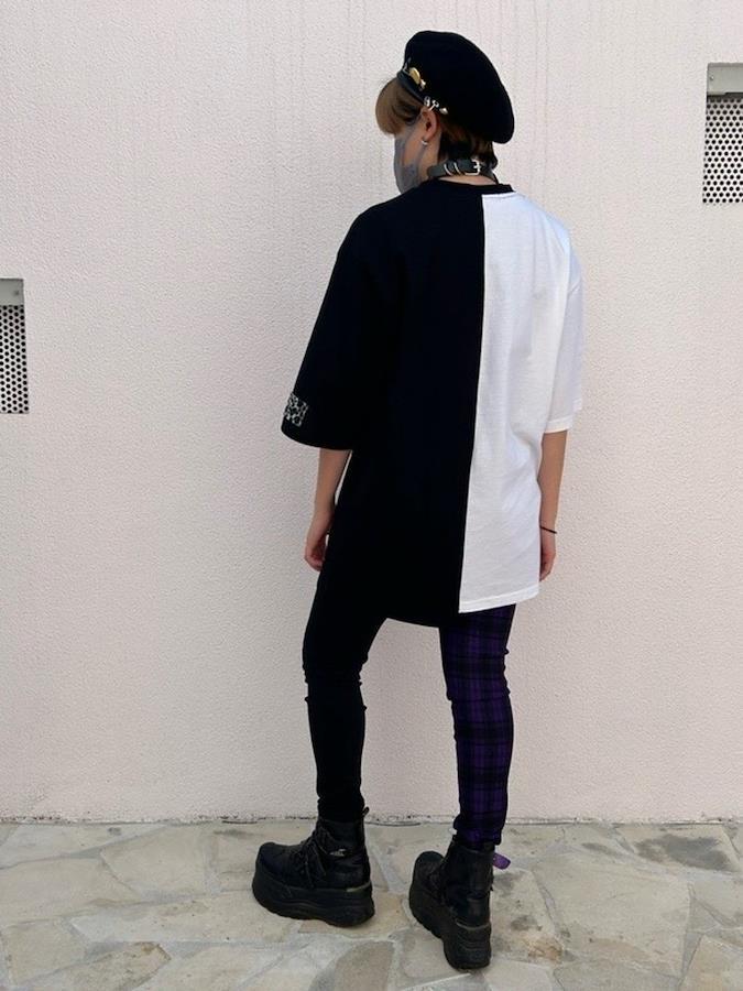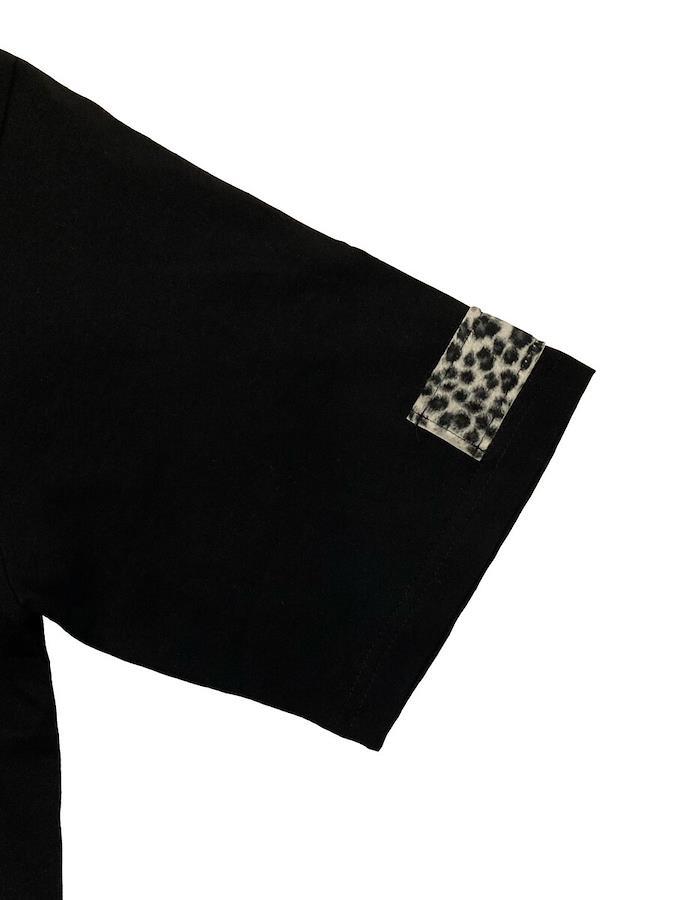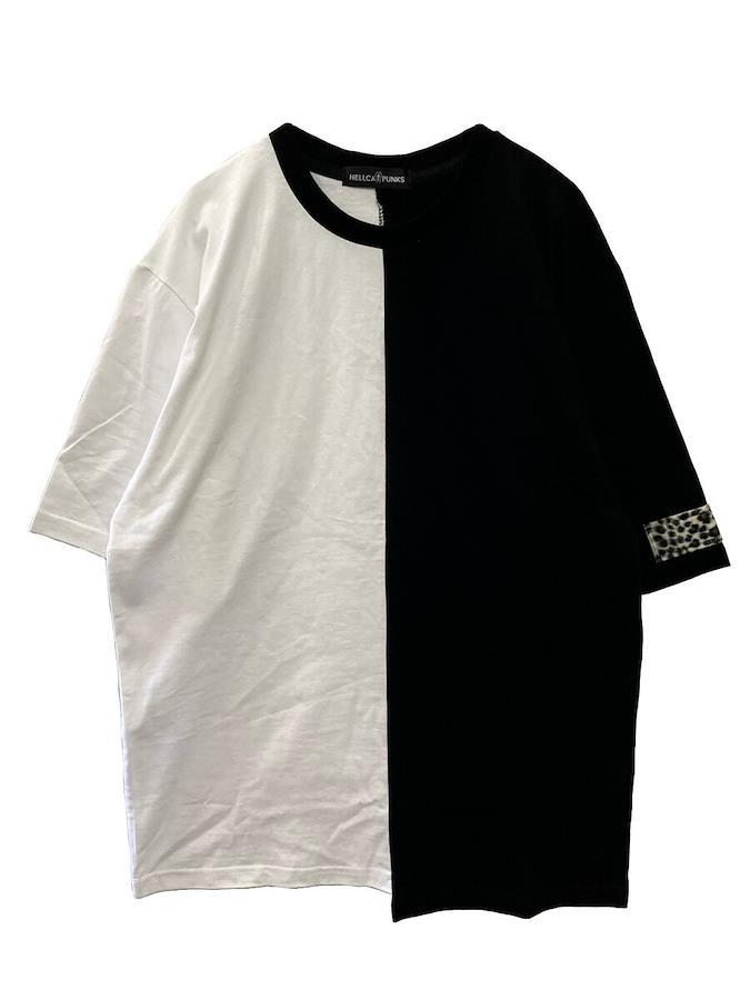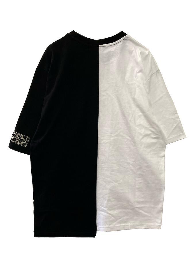 バイカラーが目をひくアシメTシャツ。左袖のヒョウ柄パッチがアクセント☆男女問わず着用可能なビッグサイズです。