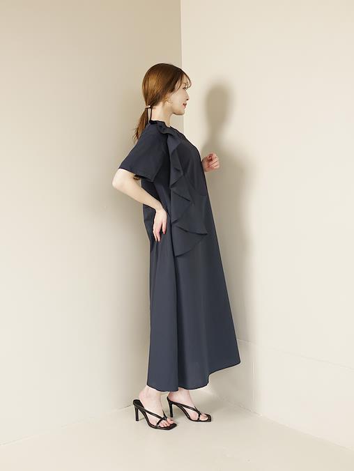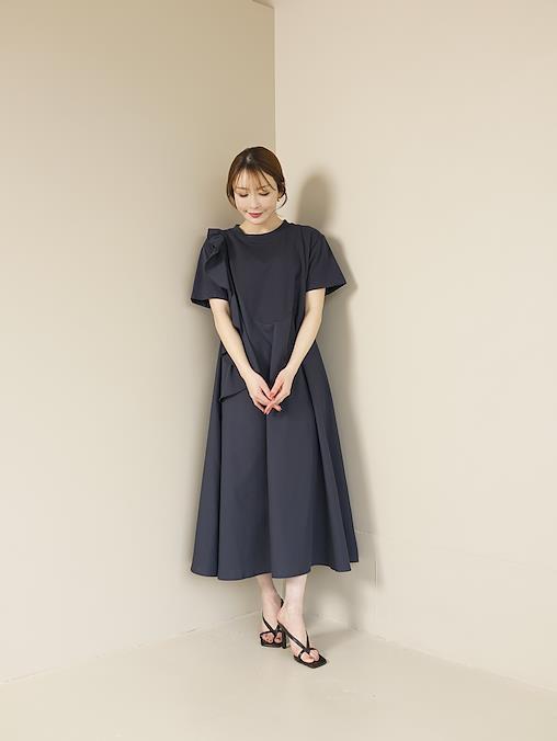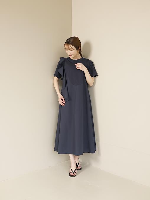 ウエストに向かって斜めに入った布帛素材を使用したフリルデザインやスカート部分を切り替えたデザインがポイントのAラインのカットソーワンピースです。