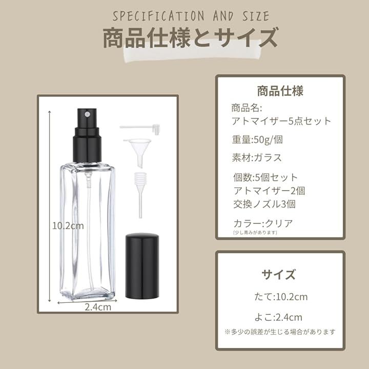 「商品仕様」商品名:アトマイザー5点セット 重量:50g/個 素材:ガラス 個数:5個セット アトマイザー2個 交換ノズル3個 サイズ10.2cmx2.4cm カラー:クリア(少し青みがあります)